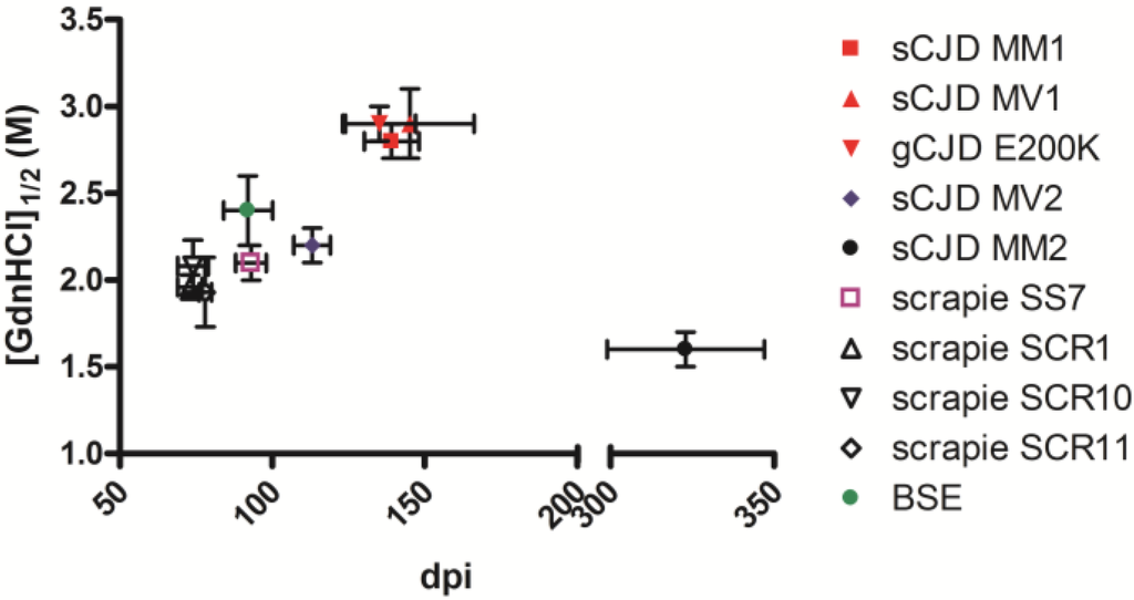 Graph of survival times (day post inoculation, dpi) and the conformational stability of PrPSc ([GdnHCl]1/2) of human and animal isolates transmitted to bank voles. Mean survival times ± SD after the third passage were: sCJD MM1, 139 ± 9; sCJD MV1, 145 ± 21; gCJD E200K, 135 ± 12; sCJD MV2, 113 ± 6 (second passage); sCJD MM2, 323 ± 24; scrapie SS7, 93 ± 5; scrapie SCR1, 73 ± 4; scrapie SCR10, 74 ± 5; scrapie SCR11, 78 ± 2 ; BSE, 92 ± 8 [28]. The [GdnHCl]1/2 values (mean ± SD) obtained by CSSA were: sCJD MM1, 2.8 ± 0.1 [11]; sCJD MV1, 2.9 ± 0.2 [11]; gCJD E200K, 2.9 ± 0.1 [11]; sCJD MV2, 2.2 ± 0.1; sCJD MM2, 1.6 ± 0.1 [11]; scrapie SS7, 2.0 ± 0.1 [11]; scrapie SCR1, 2.0 ± 0.1; scrapie SCR10, 2.1 ± 0.1; scrapie SCR11, 1.9 ± 0.2 ; BSE, 2.4 ± 0.2.