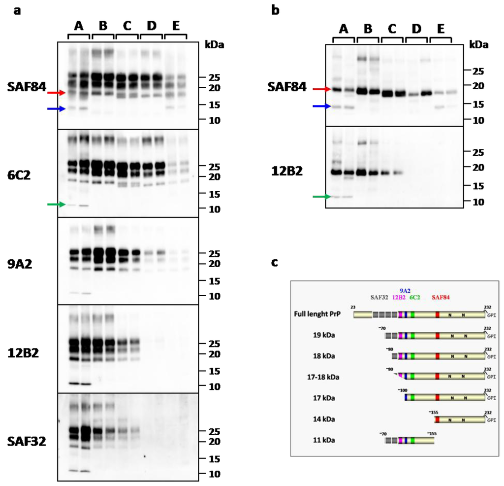 The PrPres type D, found in BSE, was characterized by a single C-terminal fragment of 17 kDa which was well detectable with SAF84 and 6C2, but barely detected by 9A2, and not at all by 12B2 and SAF32 mAbs (Figure 1a,b).