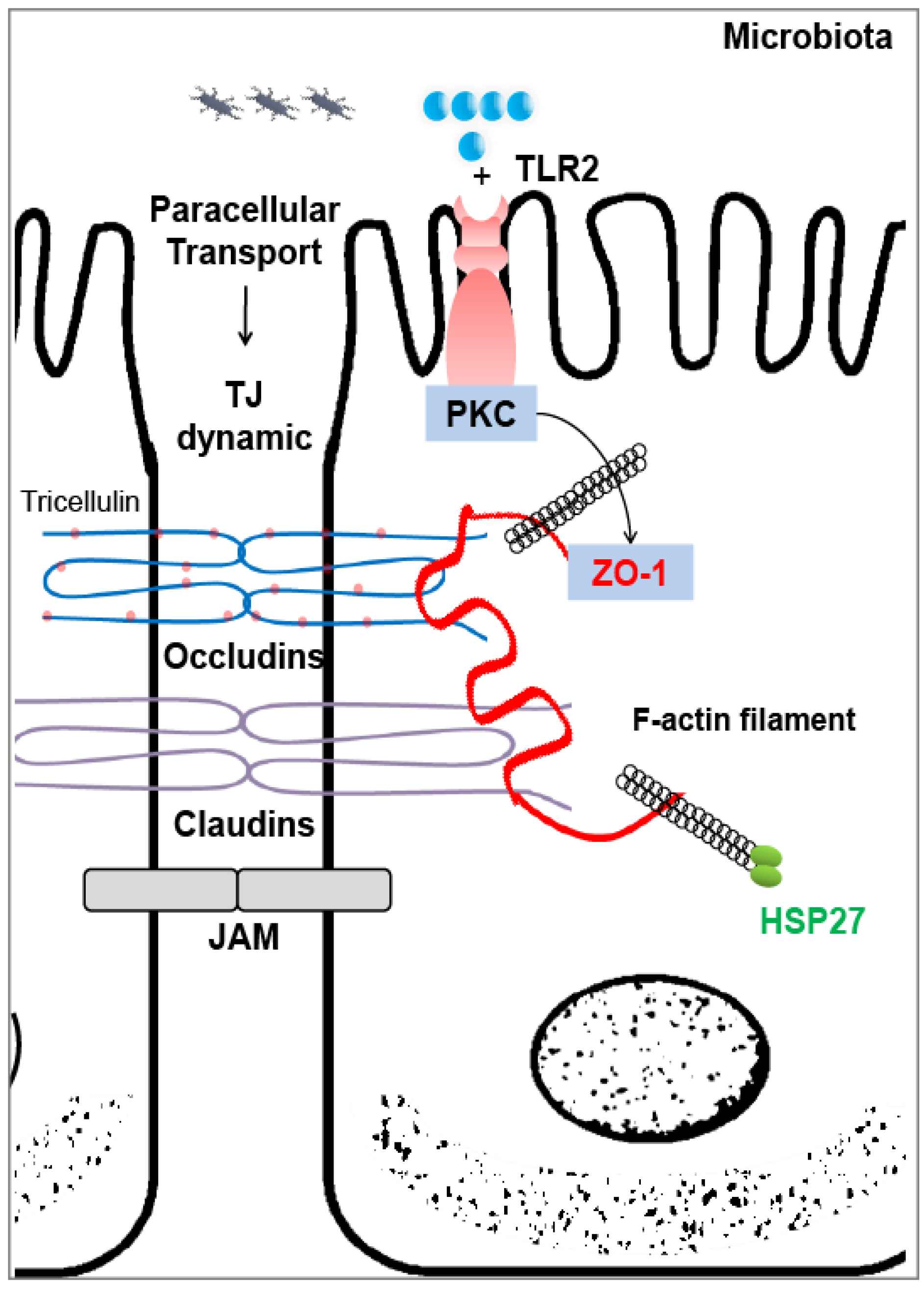 Schematic diagram showing the proposed mechanisms of intracellular HSP27 function as a tight junction (TJ) stabilizer. The TJ is composed of multiple interacting proteins, including occludins, claudins, junctional adhesion molecules (JAM) and ZO-1, that can bind to F-actin to stabilize the cytoskeleton. Intracellular HSP27 can also modulate F-actin, which may further regulate TJ through this pipeline, achieving TJ stabilization. This reaction can be initiated by toll-like receptor 2 (TLR2) in intestinal epithelial cells sensing microbial signals followed by protein kinase C (PKC) inductions.