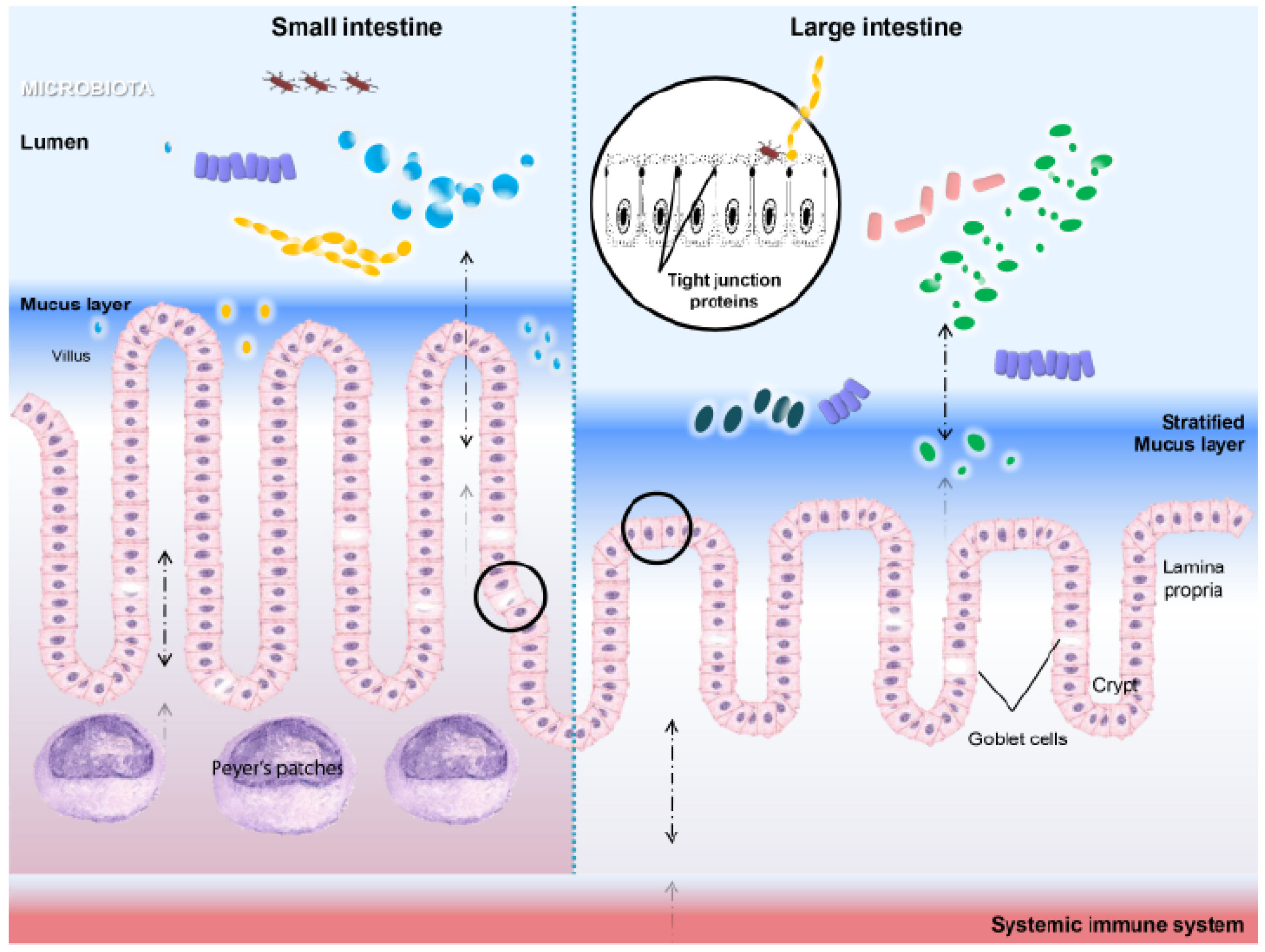The intestinal microenvironment: small intestine vs. large intestine. Intestinal epithelial cells (IECs) constitute a single cell layer barrier that is sealed by tight junction proteins and, therefore, separate the internal tissue from the external environment. Goblet cells in the intestine produce mucin, which is organized into a stratified mucus layer. The stratification is more apparent in the large intestine, where a firm inner mucus layer is largely impervious to bacterial penetration. At the mucosal interface, there is a constant signaling between bacteria and the host, including the lamina propria and the underlying Peyer’s patches (PPs) containing abundant myeloid and lymphoid cells. The interactions between microbes and IECs and between IECs and immune cells extends beyond the gut (i.e., in circulation) and is pivotal regarding adaptive immune response activation and the maintenance of host homeostasis.