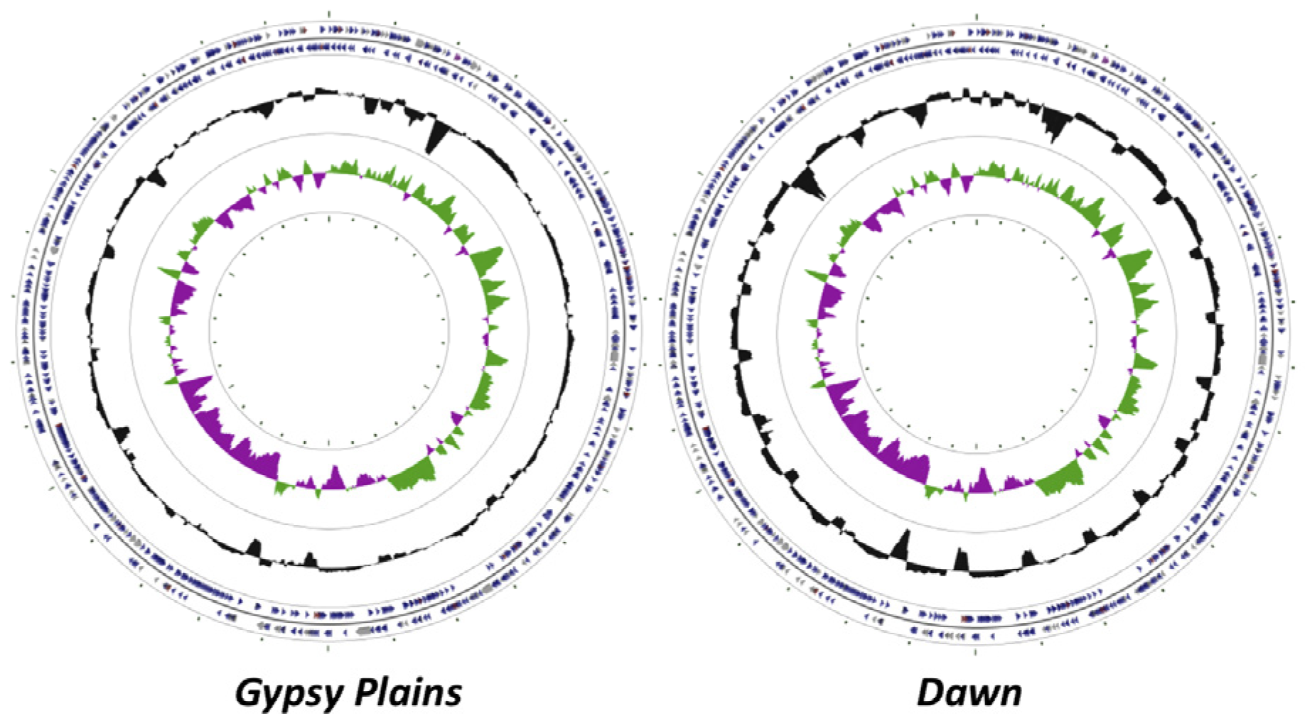 Circular display of the annotated chromosomes of the Gypsy Plains and Dawn strains of A. marginale. The circular representation of the Gypsy Plains and Dawn genomes are shown. CDSs are highlighted with blue colored arrows; tRNAs are highlighted with red arrows and rRNAs with grey arrows. The GC (Guanine-Cytosine) content is shown by a black histogram. The GC skew is indicated by a green histogram on the plus strand and by a purple histogram on the minus strand.