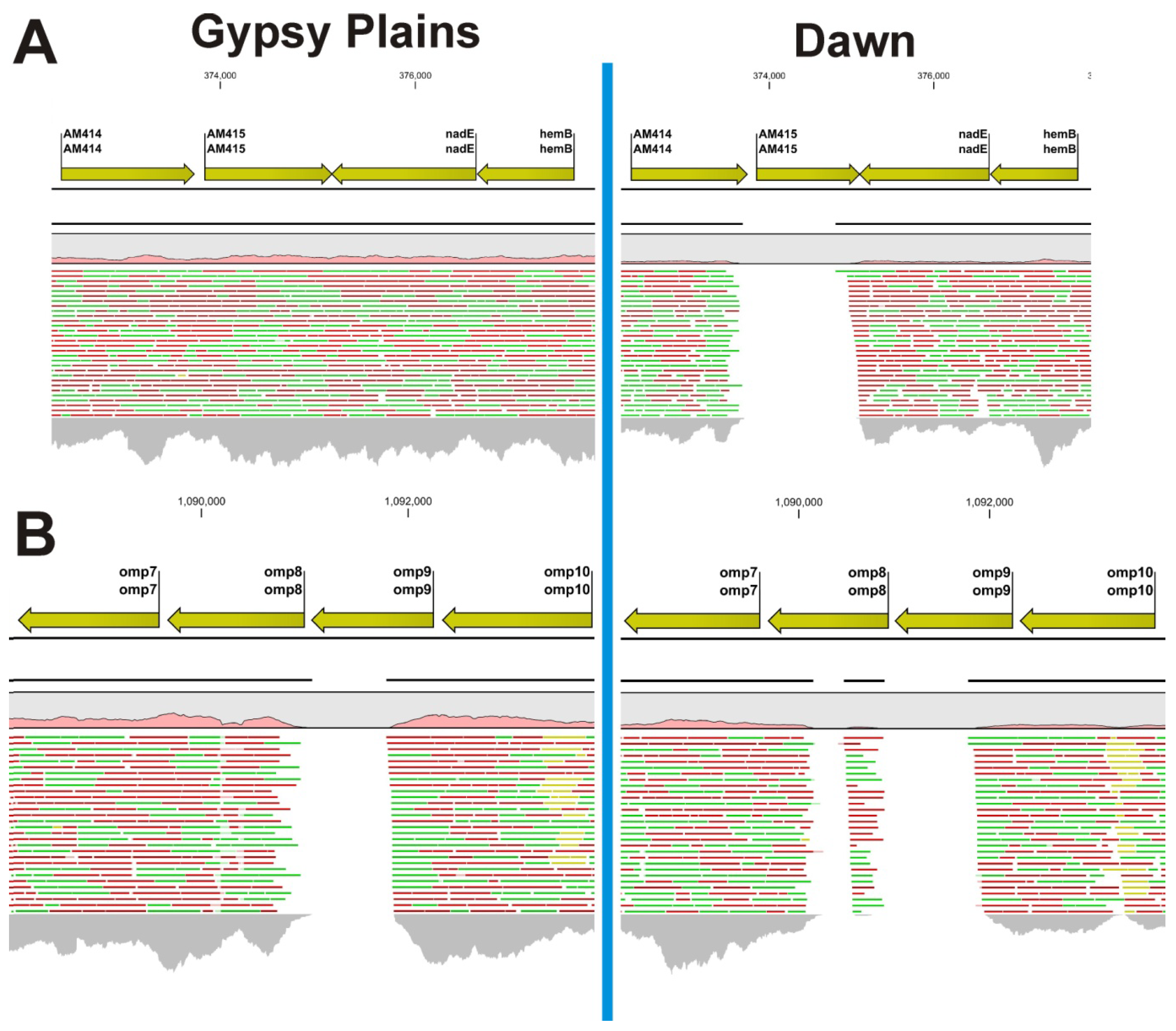 Read mapping highlights large INDELs in the Gypsy Plains and Dawn strains. Mapping of 454 reads to the St. Maries genome of A. marginale highlights large INDELs in the Gypsy Plains and Dawn strains. Positions in the St. Maries genome are shown on top of the figure. Genes and their annotation in the St. Maries genome are shown with yellow arrows. A pink histogram shows coverage relative to whole genome mapping. Red, green and yellow lines represent the reads mapped to that particular region of the genome. Green reads have been mapped in forward direction; red reads have been mapped in reverse direction. Yellow reads are reads that have multiple equally good alignments to the reference. The CLC4 and GxWb5.5 mapping algorithms were used with the following parameters: mismatch cost 2, insertion cost: 3, deletion cost: 3, length fraction: 50%, and similarity fraction: 80%. The grey histogram at the bottom of the figure shows coverage depth for that particular region of the genome. (A) Shows the INDEL found in the Dawn strain for gene AM415. This 1193 bp long INDEL is only found in the non-transmissible/low virulence Dawn strain. Gene AM415 is present in the Gypsy Plains strain; (B) Shows the INDELs found at positions 1091010–1091800 in the Gypsy Plains strain. This INDEL affects the omp8 gene and is 791 bp long. Two INDELs were found for the Dawn strain in the same region of the genome. These two INDELS are found at positions 1090143–1090469 and 1090890–1091782, with 327 and 892 bp in length, respectively for the Dawn strain. While the INDEL for the AM415 gene was confirmed through PCR, amplification of the omp6-10 operon revealed a 1.5 kb deletion common to both Australian strains. The mapping discrepancies shown in this figure are likely due to sequence diversity of the Australian omp genes.