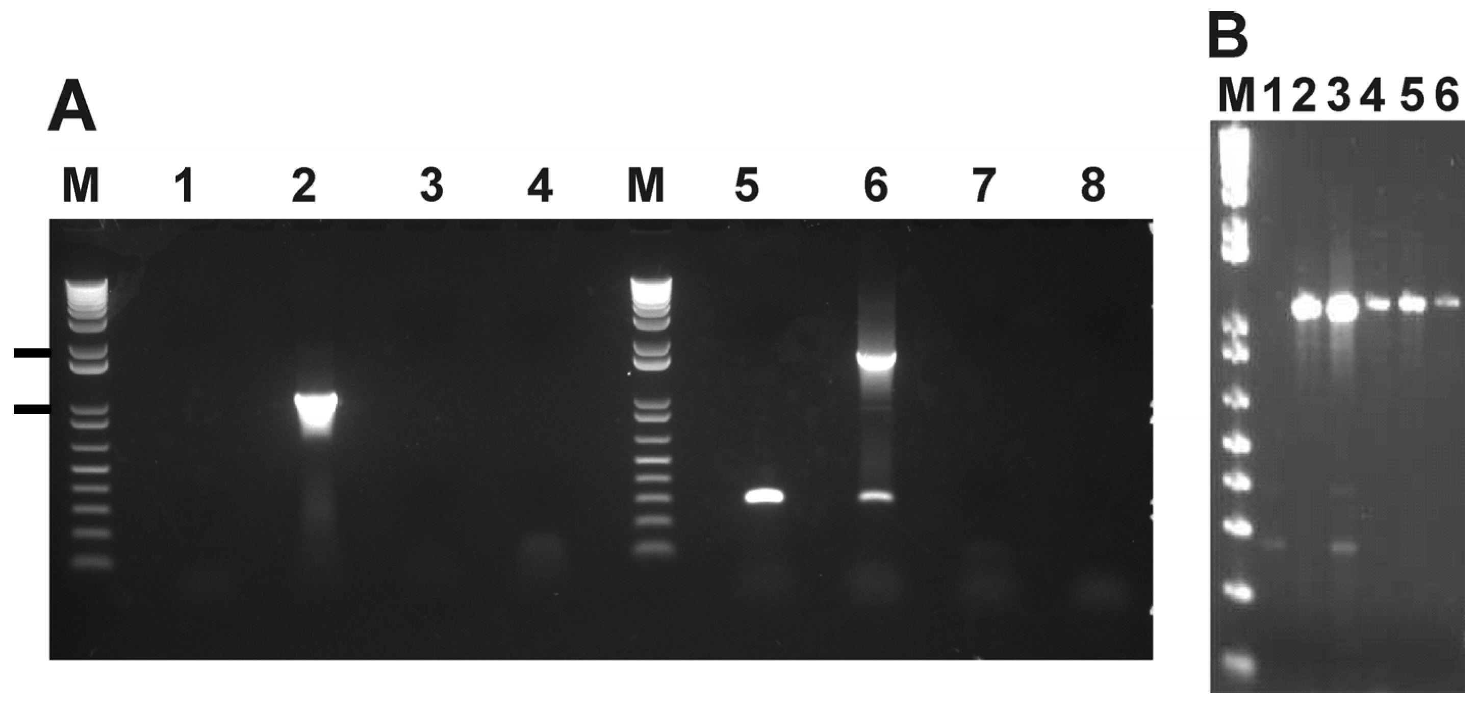 Amplification of the AM415 INDEL in A. marginale strains and field isolates. Panel A shows amplification of the AM415 INDEL in the Dawn and Gypsy Plains strains with two different primer sets. Lanes 1 and 5 contain DNA from the Dawn strain, lanes 2 and 6 contain DNA from the Gypsy Plains strain, lanes 3 and 7 contain DNA from the unrelated tick-borne pathogen Babesia bovis and lanes 4 and 8 contain a water control (no template). Lanes marked M is the 1kb Plus DNA ladder (Life TechnologiesTM) with bands of 1,000 and 2,000 bp indicated on the left. Lanes 1–4 show results using primer set AM415 designed to sit inside of the INDEL and show the absence of amplicon in the Dawn strain. The expected size of the product was 1,027 bp in Gypsy Plains. Lanes 5–8 show results using primer set AM415L which is designed to show a size difference between the Gypsy Plains and Dawn strains by flanking the INDEL. The expected size of the products was 1,684 bp for Gypsy Plains and 331 bp for Dawn. Panel B shows usage of primer set AM415L with several virulent field isolates. Lane 1 shows the Dawn strain, lane 2 field isolate P11-72270, lane 3 shows the Gypsy Plains strain and lanes 4 through 6 show isolates P11-702600009, P11-702600001 and P11-702600005 respectively.