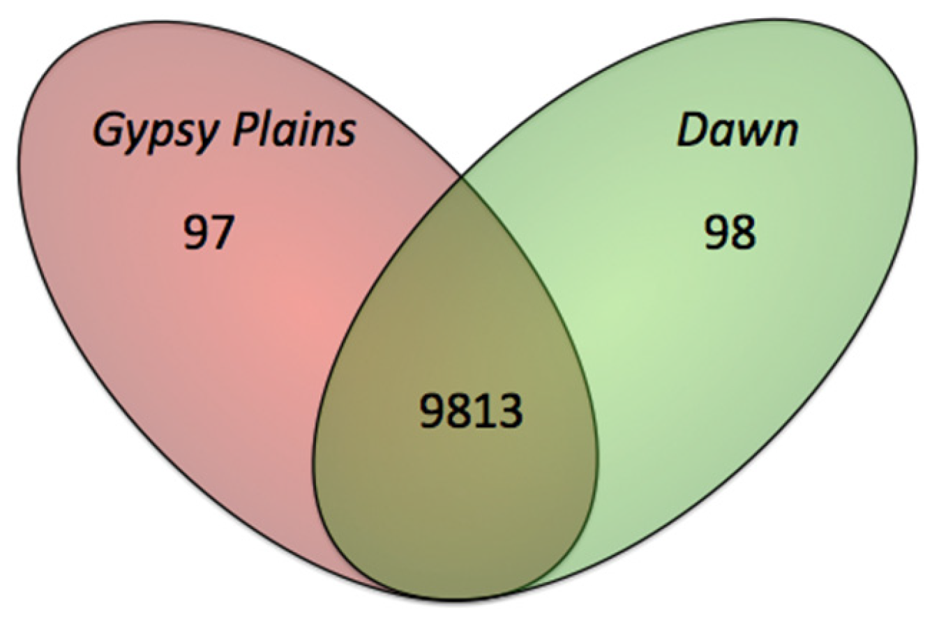 Single Nucleotide Polymorphisms (SNPs) identified between the Gypsy Plains, Dawn and St. Maries strains of A. marginale. The Venn diagram shows the SNPs found between the St. Maries, Gypsy Plains and Dawn strains of A. marginale. A total of 10,008 SNPs was identified when comparing the two Australian strains to the St. Maries strain. The sum of 9,813 SNPs were found to be common to both Australian strains when compared to St. Maries. Only 97 (shown in pink) and 98 (shown in green) of these SNPs were unique to either the Gypsy Plains or Dawn strain, respectively.