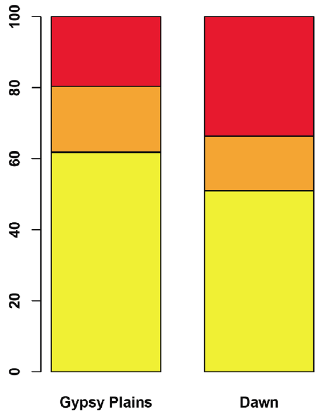 Functional classification of segregating variants The proportion of segregating variants assigned to each class as evaluated by the SNPeff algorithm in the Gypsy Plains and Dawn strains is shown. Red shows missense variants, orange shows silent variants, and variants that fell into the “none” category are shown in yellow.