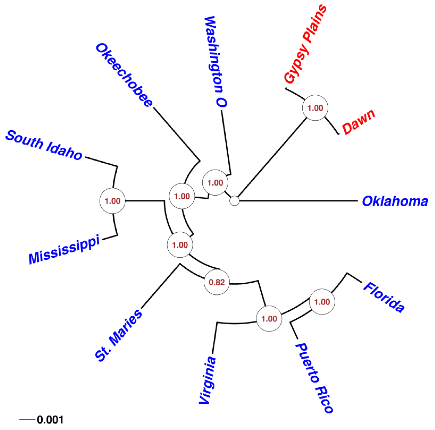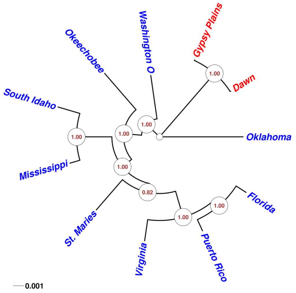 Phylogenetic analysis of 11 sequenced A. marginale genomes. A circular unrooted phylogenetic tree that displays the relationships between all 11 sequenced A. marginale genomes is shown. All but one of the clades generated were resolved in 100% of all tree calculations (1.00 alTR); this was confirmed using bootstrapping analysis. Predictably, the Australian strains, highlighted here in red, fell into their own distant branch in the tree.
