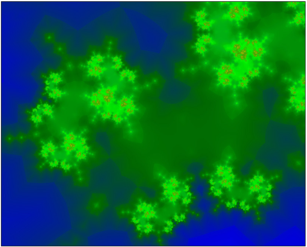 Fractal evolution model. Artwork describing ideally a fractal evolution model showing the outcome of new offspring (light green islands) with fitness advantages which are fixed and explode (darker islands nuclei), although the evolutionary pattern is maintained (fractal periodicity). On the other hand, small generations could be slower in their evolution or disappear in the time lapse. This model is established by representing a continuum among all organisms inhabiting a given environment.