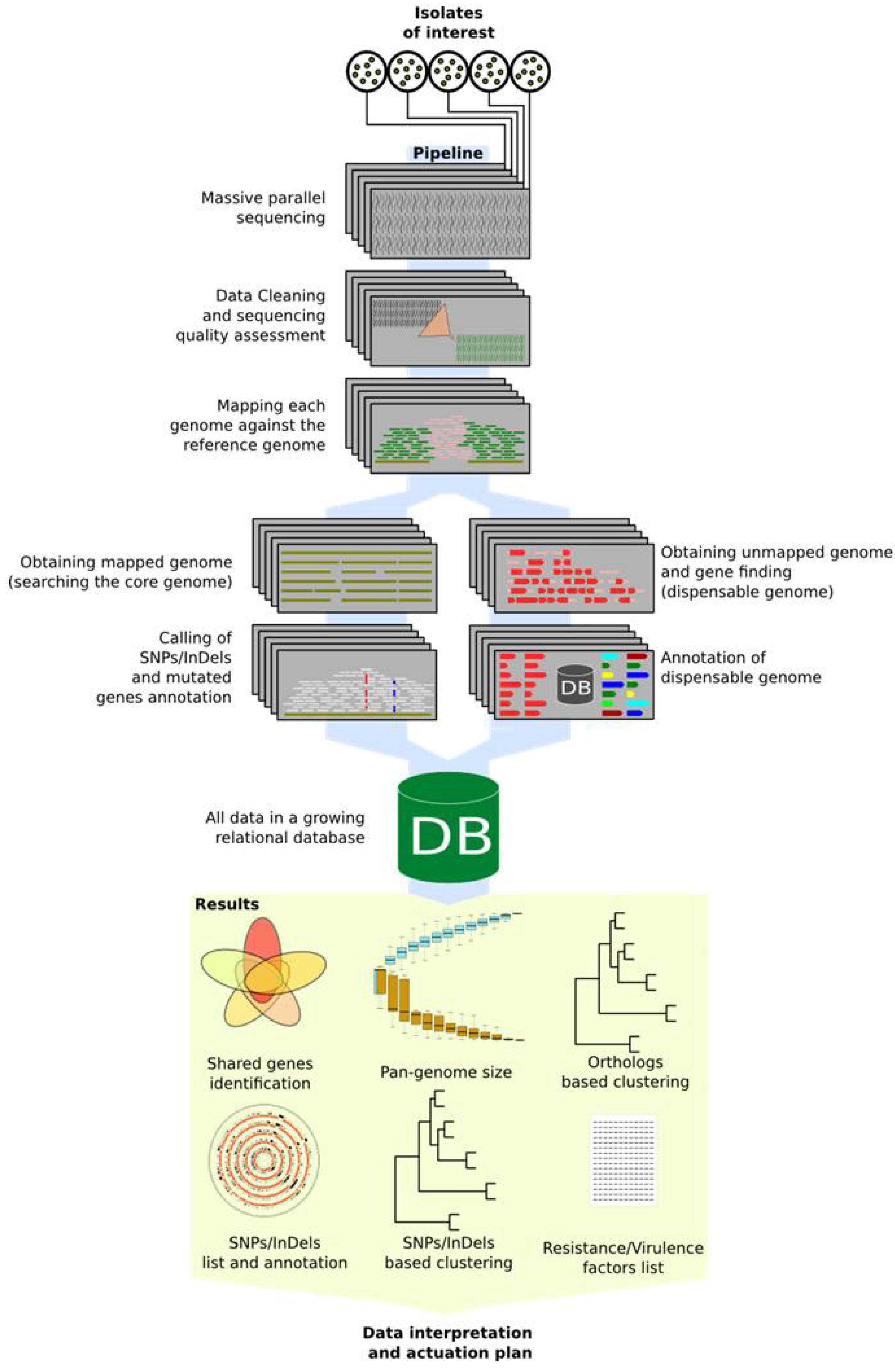 The applied pipeline starts from sequence data going step-by-step from data cleaning and quality assessment through the production of useful intermediate data characterising, on one hand gene-related data in a pan-genomic context, and on the other hand, the mutation profiles.