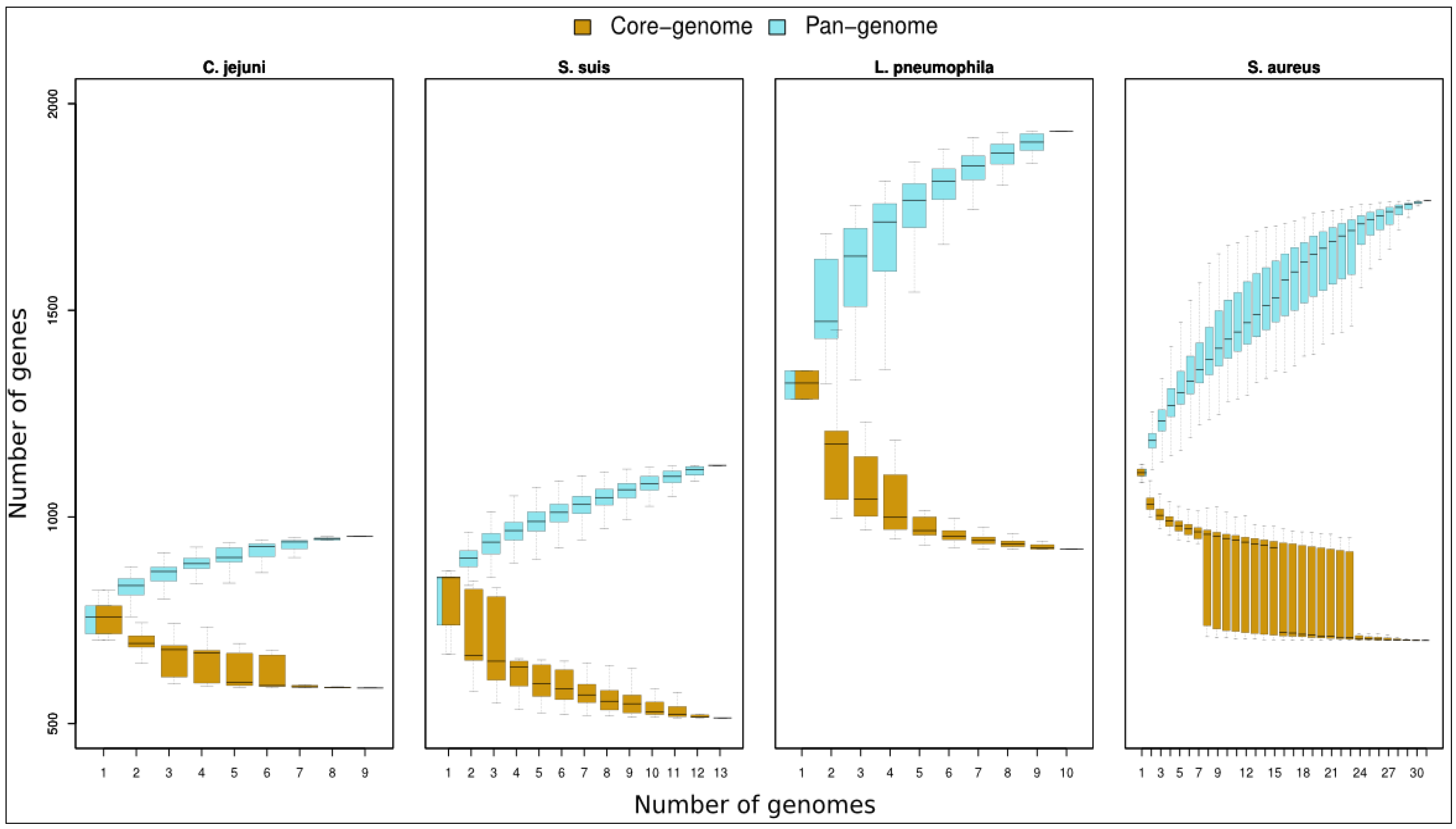 By analysing bacteria belonging to the same species at a whole genome level, comprehensive comparative genomics can be carried out. Shared genes among multiple strains are mostly related to house-keeping genes or central metabolic processes, most of the structural information and main genotypic features. The core genome could be thought as the number of shared features in a pool of genomes. The size of the core genome decreases, increasing the number of genes added to the pool. While it is possible to link the core genome to common tracts among considered bacteria, it is worth mentioning that such a calculation also depends technically on the number of genomes available for the computation. In this review, we propose a comparative analysis example of some organisms considering all genomes currently deposited in GenBank of Campylobacter jejuni (nine genomes), Streptococcus suis (13 genomes), L. pneumophila (10 strains), and Staphylococcus aureus (31 genomes, see SI1 for a strain list).