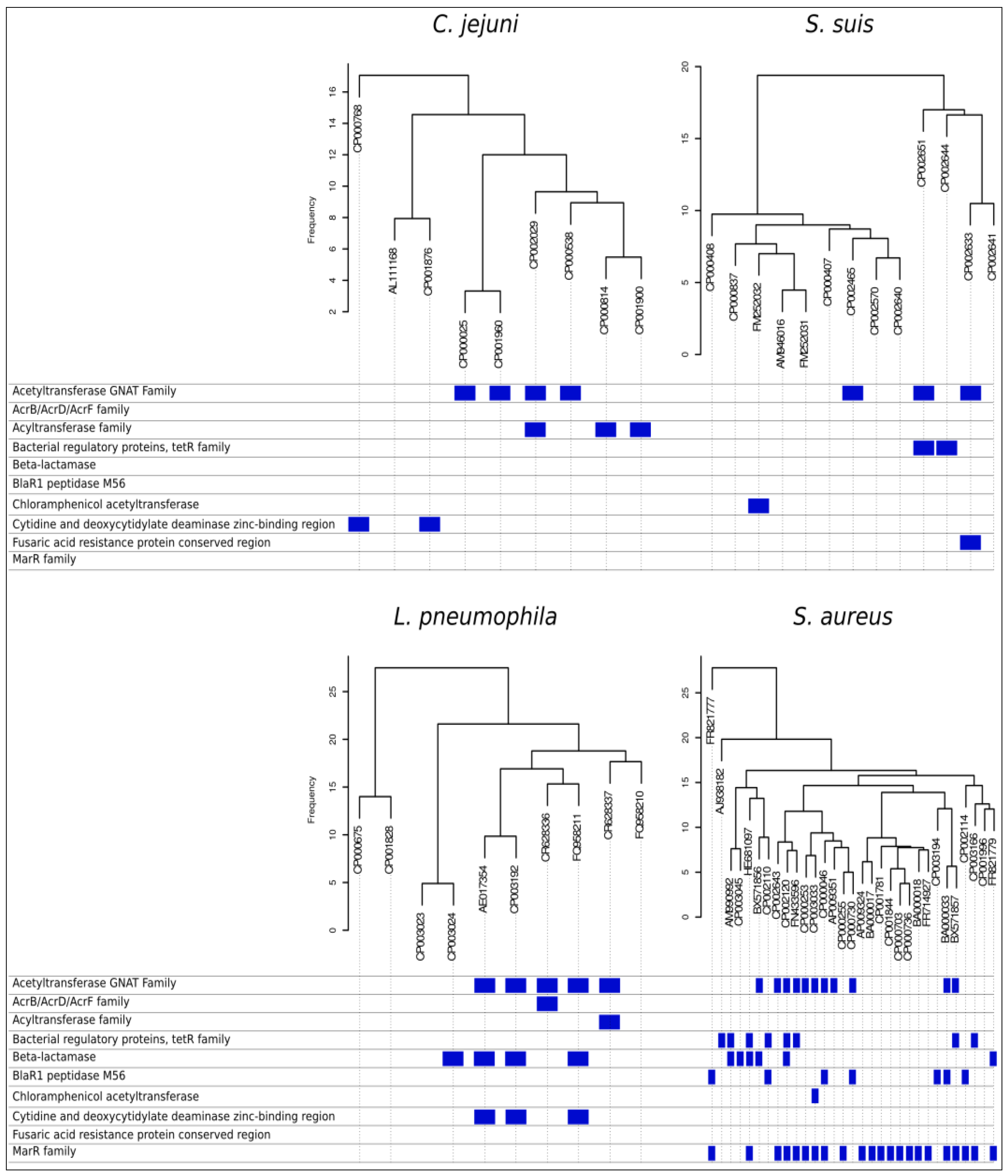Antibiotic resistance factors. Dendrograms shows distribution among strains of C. jejuni, S. suis, L. pneumophila and S. aureus based on presence/absence of orthologues genes. For each genome, the presence of dispensable genes related with antibiotic resistance is identified, and by applying automatic pan-genome analysis, the pipeline is reported.