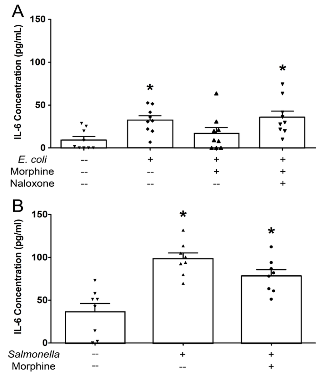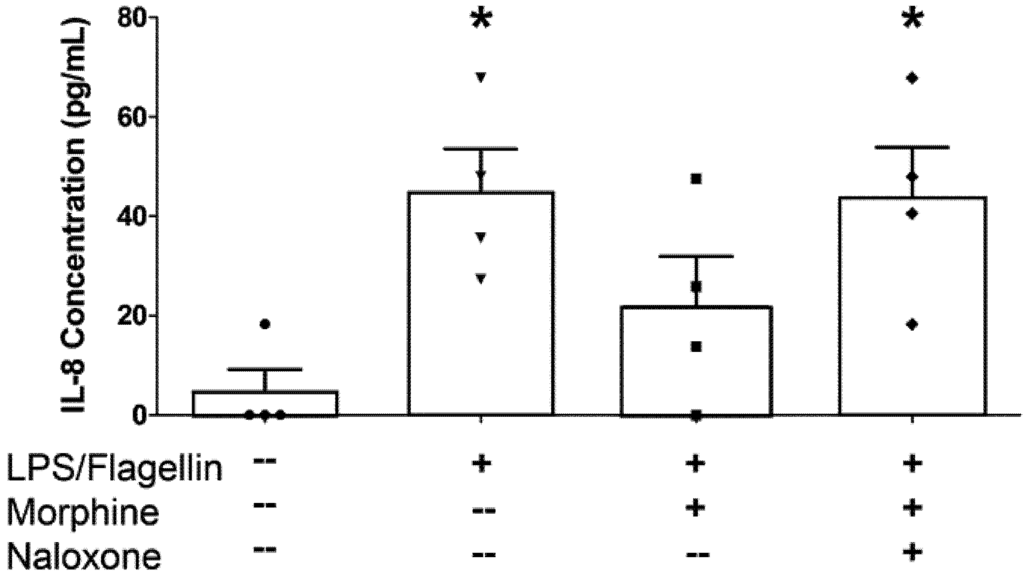 Morphine sulfate was obtained from the National Institute on Drug Abuse (Bethesda, MD, USA). Naloxone, dexamethasone and lipopolysaccharide (LPS, purified from S. Typhimurium) were obtained from Sigma-Aldrich (St. Louis, MO, USA). Flagellin was purchased from Enzo Life Sciences (Farmingdale, NY, USA).