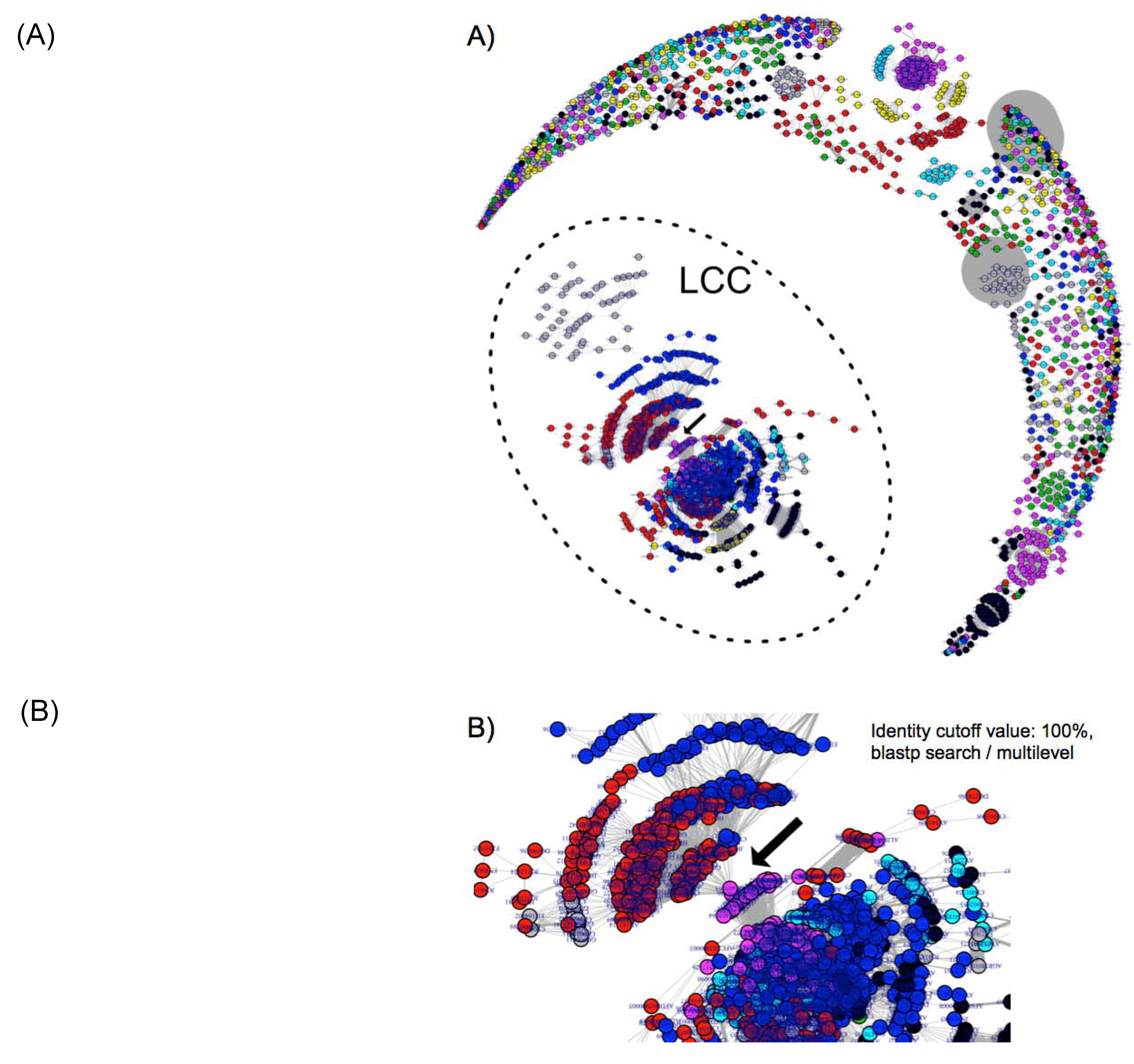 | Clustering program | Identity cutoff (%) | Edges | Connected nodes | Connected components | Nodes in LCC | LCC % in total | Number of communities in the LCC using multilevel method |