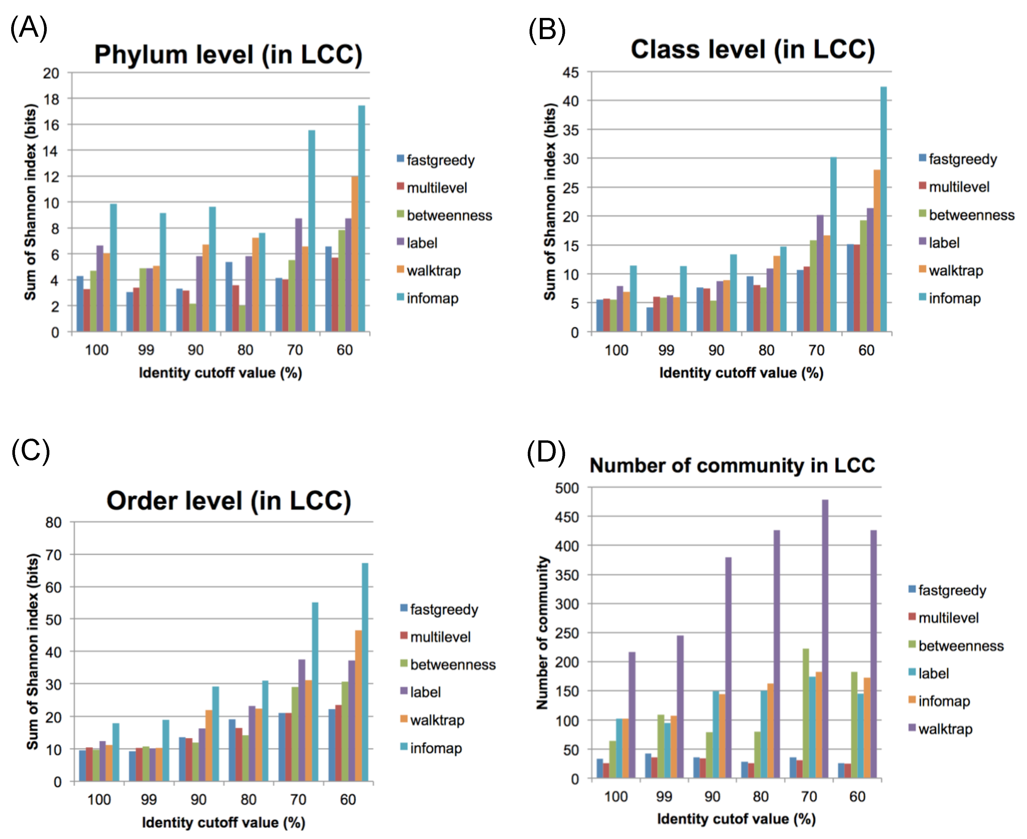 Evaluation of community connections using several methods. The Shannon index values for the LCC using different identity cut-off values and community estimation methods at the phylum (A), class (B), and order (C) levels. (D) The numbers of communities in the LCC using different identity cut-off values.