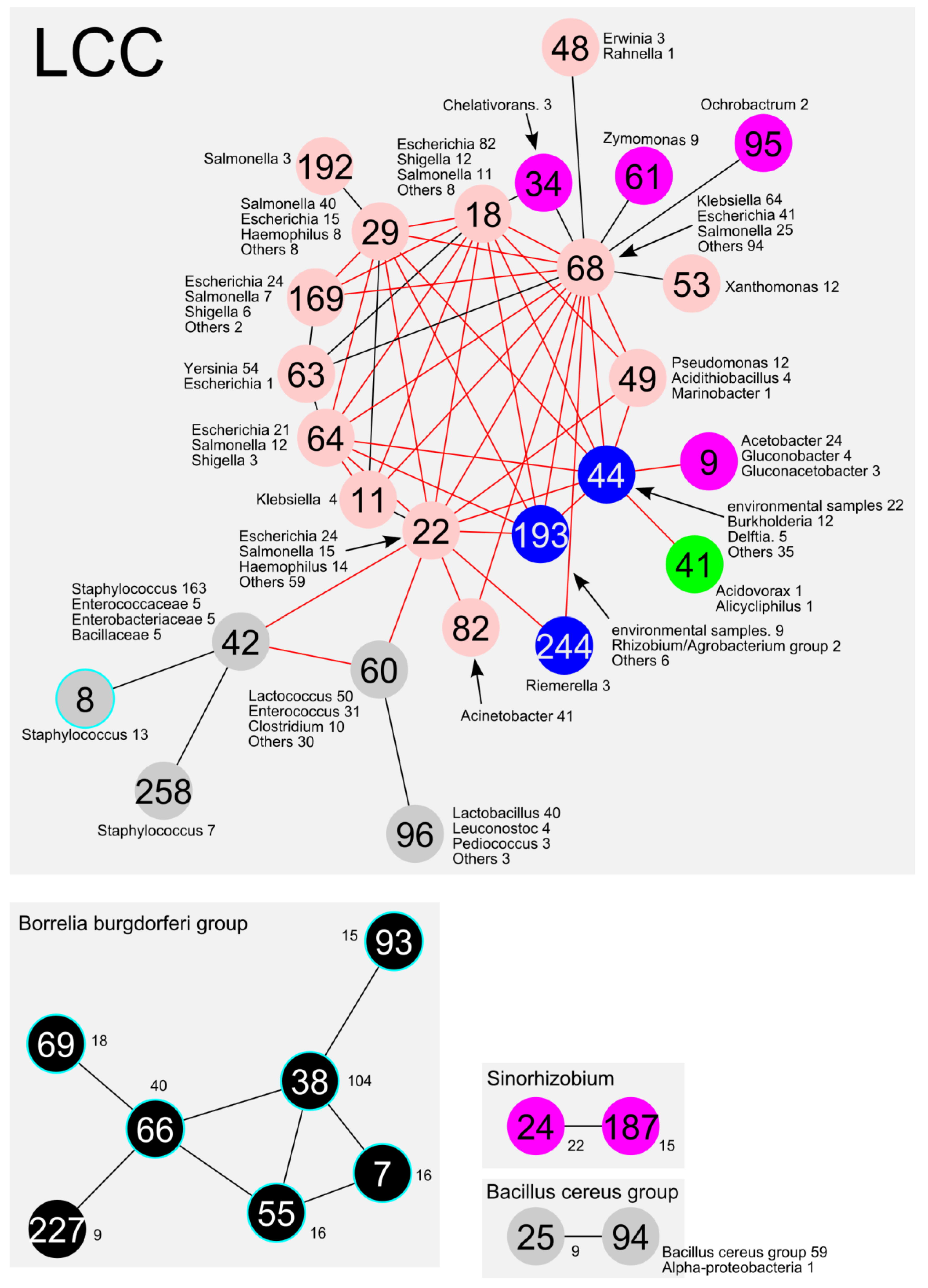 A schematic representation of the communities from the whole image shown in Figure 1. The communities mainly included Alphaproteobacteria, Betaproteobacteria, Gammaproteobacteria, Bacilli, and Borrelia, which are indicated by purple, green, pink, grey, and black circles, respectively. The other communities are indicated by blue circles. The number of the top three species in the community is shown beside the circle. The circle with the light-blue rim represents the communities without AMR genes. The red lines represent the AMR gene related connections among the communities.