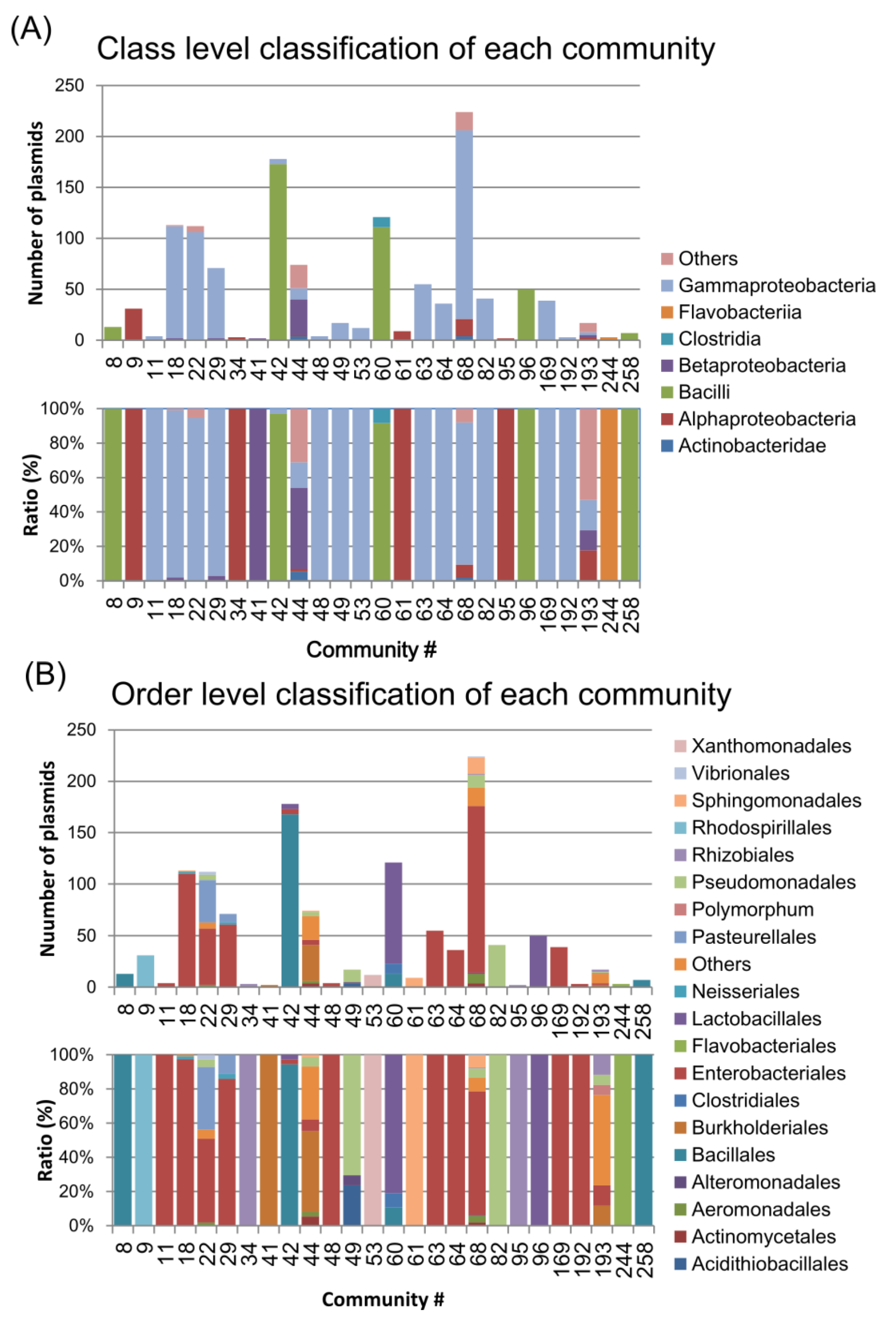 The host bacterial components of the communities. The upper and lower graphs show the numbers and ratios of the host bacterial components, respectively, for the class (A) and order (B) levels.