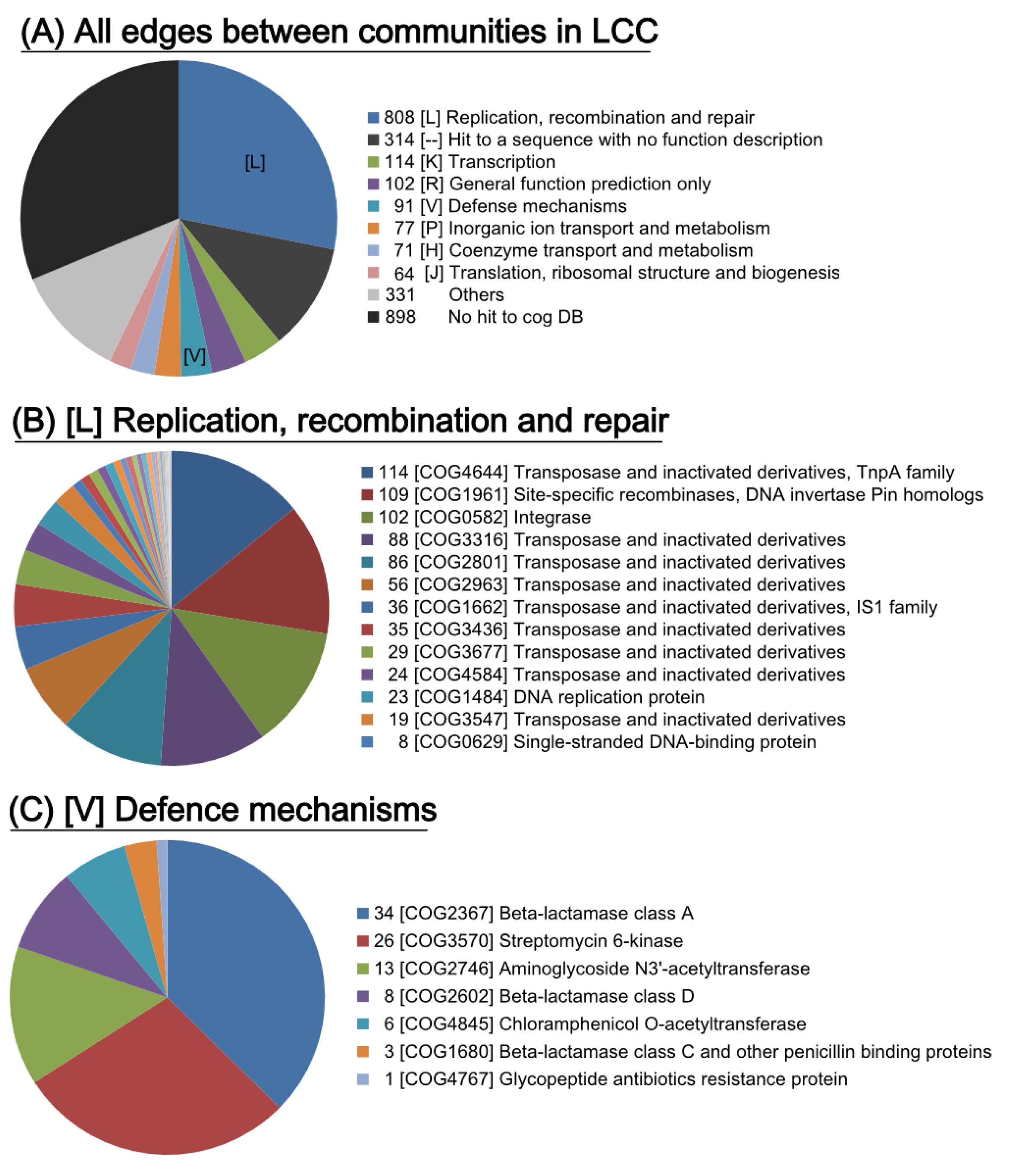 COG annotation for genes on the edges between communities. (A) COG categories on all of the edges in the LCC. (B) The COG ID for the category [L] of replication, recombination and repair. (C) The COG ID for the category [V] of defence mechanisms.