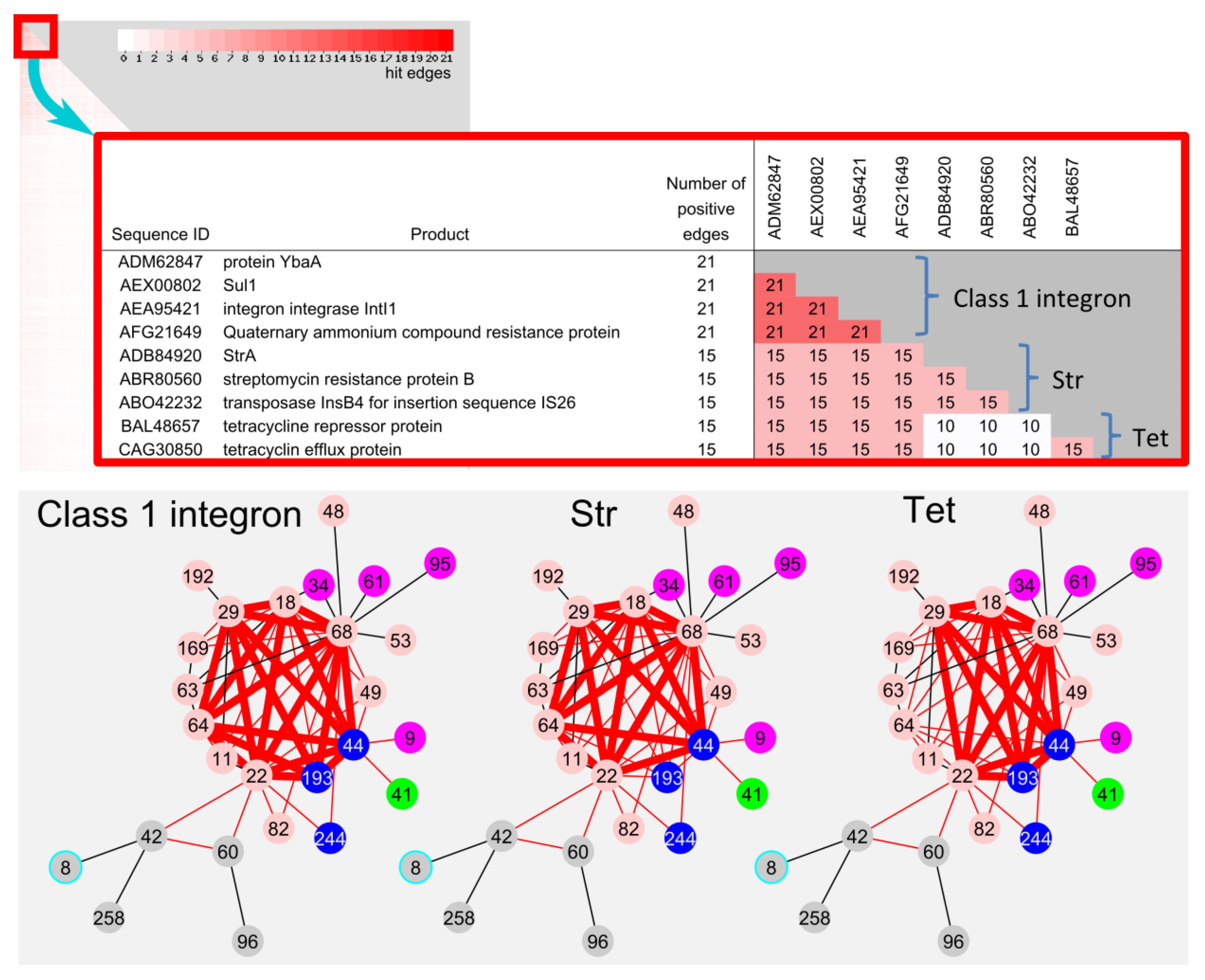 Frequently hit sequence on the 66 edges in LCC. Heatmap of sequence pairs of 1506 sequences on the 66 edges in LCC. Close-up of top 9 frequently hit sequences. Class 1 integron (21 edges), str (15 edges) and tet (15 edges) genes on the edges were shown in bold red line.
