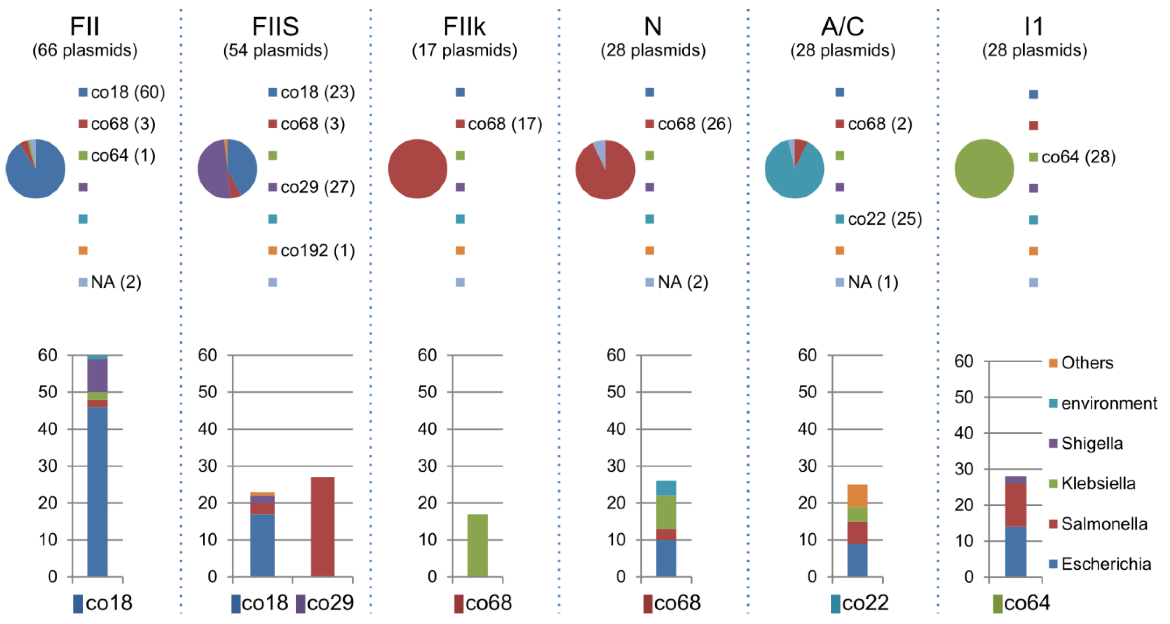 The carbapenemases K. pneumoniae carbapenemase (KPC) and New Delhi metallo-ß-lactamase (NDM-1) were unique to the co22 and co68 communities (Figure 9B). KPC was only found in co68, mainly in IncFIIk and IncN plasmids. NDM-1 was found in co22 and co68. Moreover, the NDM-1 in co22 was related only to the IncA/C plasmids. Meanwhile, the NDM-1 in co68 was not related to any Inc plasmids (Table 4 and Figure 9C). NDM-1 was closely related to co18/co22/co68 communities including plasmids carrying CTX-M and KPC. Thus, co22/co68 have the most potential for the dissemination of AMR genes in Enterobacteriacea.