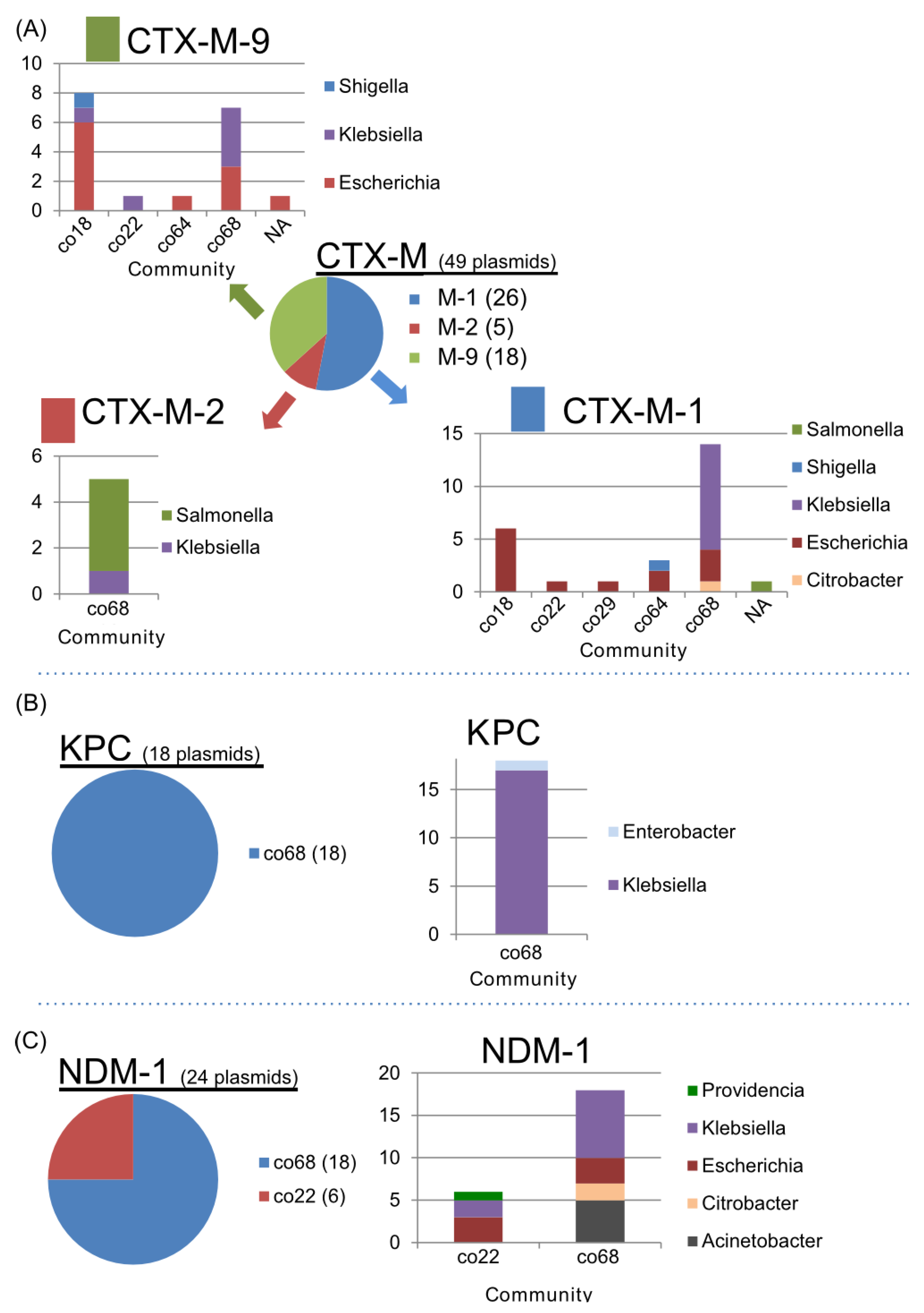 Components of the communities with AMR genes. (A) The CTX-M-1, -2 and -9 subgroups and the community and bacterial components. (B) KPC carbapenemase and the bacterial components. The plasmids carrying KPC are only found in co68. (C) The communities and bacterial components of the plasmids carrying the NDM-1 gene (Table 4).