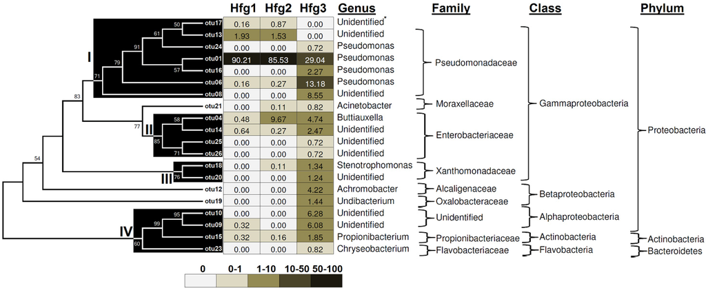 The phylogenetic relationship and distribution of sequence reads of the 82 OTUs are shown in Supplemental Figure S1. Since the top 20 OTUs represent 94.3% the bacteria reads, we focused on these OTUs for comparative analysis of bacteria abundance and diversity in different Hessian fly larval instars. Phylogenetic grouping resulted in four major clusters (Figure 3). Cluster I, the largest group with seven OTUs and 2713 (or 74.2%) reads, belongs to Pseudomonadaceae. Four of these OTUs, namely otu01, otu06, otu16, and otu24 were identified as Pseudomonas, whereas the other three could not be identified to the genus level. otu01 was the most abundant in all three samples. Cluster II, containing four OTUs and 272 (or 7.5%) reads belongs to Enterobacteriaceae. Amongst these OTUs, otu04 was identified as Buttiauxella, whereas the other three (otu14, otu25, otu26) could not be identified to the genus level at present. Cluster III consists of two OTUs, otu18 (12 reads, Stenotrophomonas) and otu20 (15 reads, unclassified). Cluster IV contains four OTUs and 153 reads, which have diverse bacterial lineages. In cluster IV, otu23 was identified as Chrysobacterium (Bacteroidetes), otu15 as Propionibacterium (Actinobacteria), and otu09 and otu10 were identified as Rhizobiales (Alphaproteobacteria). Three of the 20 abundant OTUs, otu21 (Acinetobacter, Moraxellaceae), otu12 (Achromobacter, Alcaligenaceae), and otu19 (Undibacterium, Oxalobacteriaceae), could not be placed into any of the major clusters.