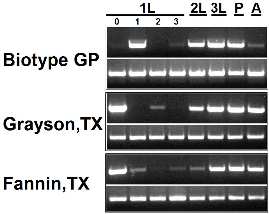 DNA extractions from various developmental stage samples of biotype GP, Grayson, TX and Fannin, TX populations were performed as described above. The Pseudomonas-specific primers (forward: TAGAGAGRWGCWYGCTTCTCTTGA and reverse: CAATTACGTATTAGGTAACTGCCC were used. Hessian fly actin gene (accession no. AF017427; forward: ATGTGTGACGACGAAGTTGCT and reverse: GGCAACATACATGGCTGGTG-3') was used as a control for template quality and quantity []. The samples were amplified in a 25 μL mixture containing 1 μL (10 ng/μL) template DNA, 12.5 μL 2× PCR master mix from Promega (with a final concentration of 0.4 mM each deoxynucleoside triphosphate, 1.5 mM MgCl2 and 0.625 units of Taq DNA polymerase in PCR reaction buffer pH 8.5) and 0.32 mM each primer. The reactions were performed on a PTC100 Thermal Cycler (MJ Research, Watertown, MA, USA) and the reaction cycle included an initial denaturation of 5 min at 95 °C followed by variable numbers of cycles of 30 s at 94 °C, 30 s at 55 °C, and 30 s at 72 °C, with a final extension of 5 min at 72 °C.