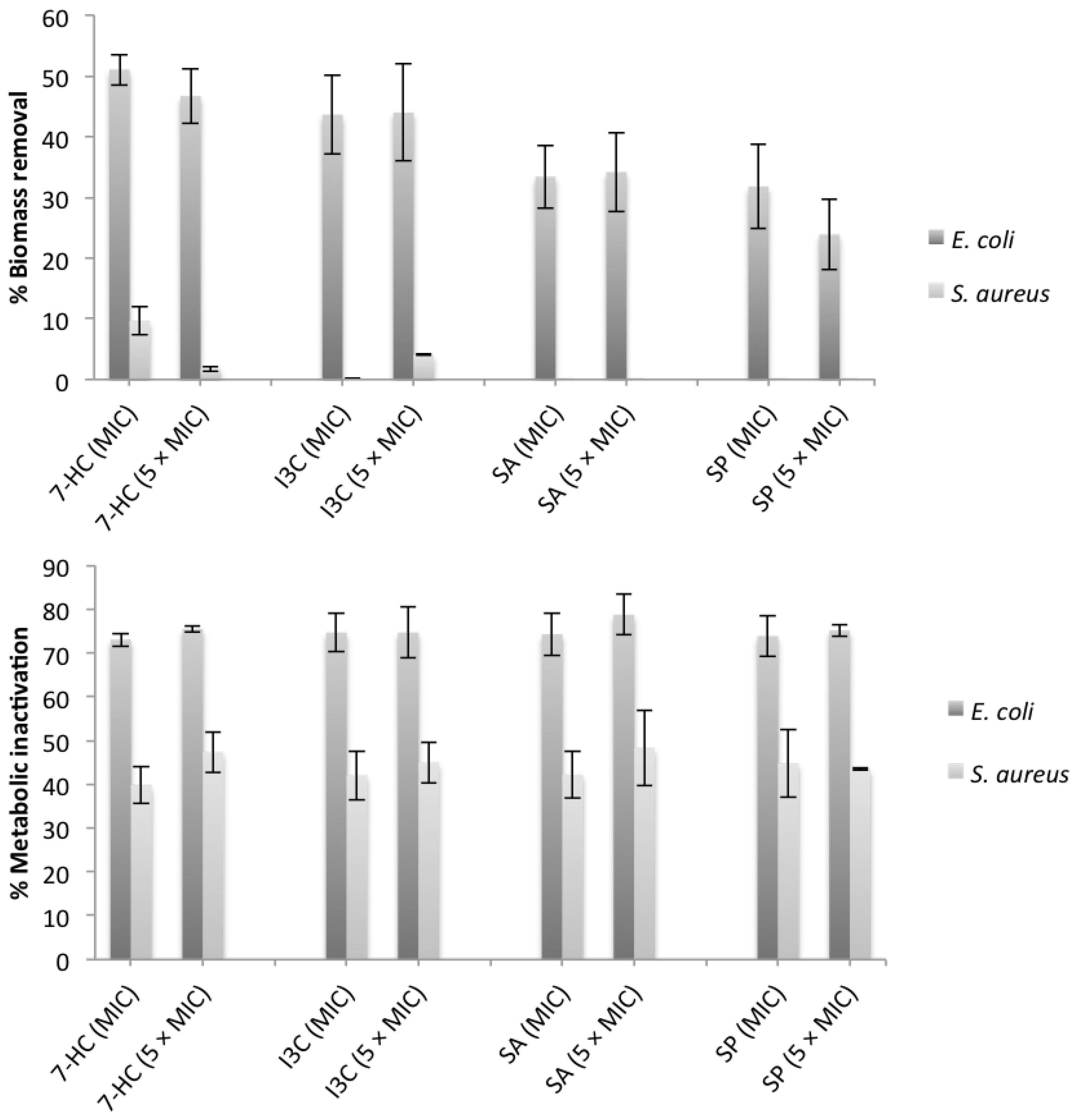 The purpose of this study was to assess the antimicrobial efficacy of selected phytochemicals (7-hydroxycoumarin (7-HC), indole-3-carbinol (I3C), salicylic acid (SA) and saponin (SP)) against E. coli and S. aureus planktonic cells. These phytochemicals belongs to two different chemical classes: phenolics and glucosinolates. These chemicals are characterized for their antimicrobial, antifungal, antioxidant and anticancer activities [7,17,18,19,20,21]. Moreover, the effects of these phytochemicals were assessed on biofilm control. The phytochemicals were placed in contact with 24 h old biofilms of E. coli and S. aureus to verify if they were able to promote biomass removal and/or metabolic inactivation. The mode of action of the selected phytochemicals on planktonic cells and in the early stages of biofilm formation was also evaluated by analyzing the effects on the surface charge, free energy of adhesion, bacterial motility and quorum-sensing inhibition (QSI). Additionally, since co-therapies between antimicrobials are being extensively applied in the clinical setting in order to increase the pharmacological activity or decrease the resistance behavior of bacteria, the phytochemicals were combined with three antibiotics (ciprofloxacin (CIP), tetracycline (TET) and erythromycin (ERY)) against several resistant S. aureus strains (S. aureus RN4220, SA1199B and XU 212) owning different efflux pumps.