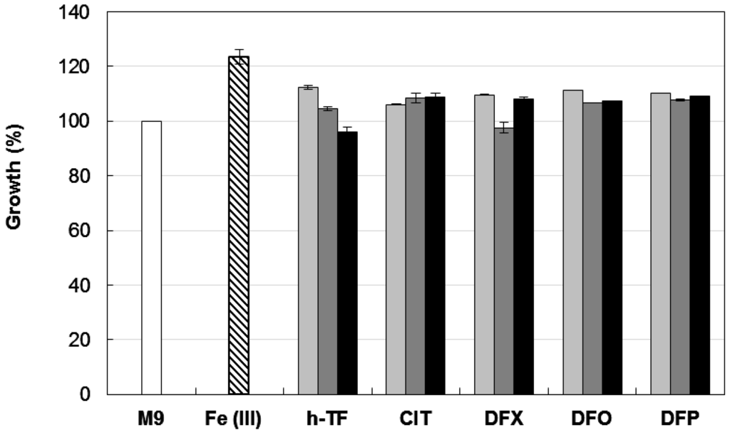 Effect of different iron chelators on planktonic growth of A. baumannii ATCC 17978. Bacteria were grown for 48 h at 37 °C in 96-wells microtiter plates containing 100 μL M9 supplemented with the indicated iron chelator at different concentrations: 32 μM (light grey bars), 128 μM (dark grey bars) or 128 μM chelator + 100 μM DIP (black bars). Growth was measured as OD600 and expressed as percentage relative to the untreated control (i.e., OD600 in M9). The average of the OD600 in control M9 was 0.318 ± 0.008 and represents 100% of growth (white bar). Relative growth in M9 supplemented with 100 μM FeCl3 is reported (striped bar). Data represent the average of three independent experiments ± standard deviation. h-TF, tranferrin; CIT, citrate; DFX, deferasirox; DFO, desferrioxamine; DFP, deferiprone.