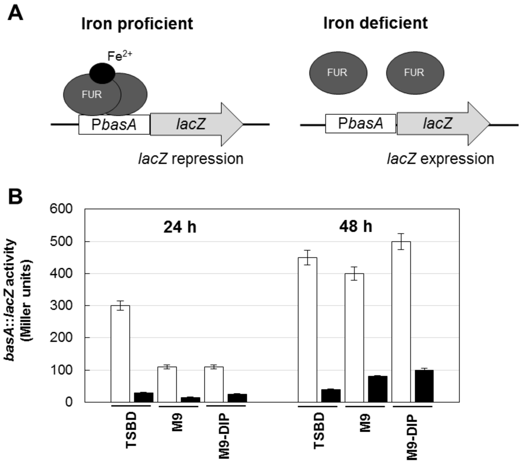 Regulatory mechanism and activity of the basA::lacZ iron biosensor in the reference A. baumannii strain ATCC 17978. (A) Schematic of the regulatory mechanism the basA::lacZ iron-regulated transcriptional fusion carried by plasmid pMP220::PbasA [26]. Under iron proficient conditions (left), the Fur repressor protein binds the PbasA promoter and inhibits β–galactosidase (LacZ) expression; under iron deficient conditions Fur repression is relieved and the LacZ enzyme is expressed. (B) Activity of the basA::lacZ iron-regulated fusion in A. baumannii ATCC 17978 grown for 24 and 48 h in different media, as indicated, in the absence (white bars) or presence (black bars) of 100 μM FeCl3. Data are the means (±standard deviations (SD)) of triplicate experiments.