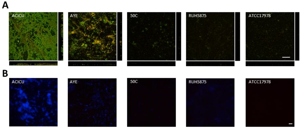 To visualize differences in biofilm structure among the five representative A. baumannii strains, biofilm formation on glass slides was monitored during seven days growth in TSBD by means of confocal microscopy, according to a previously described procedure [37] (Figure 4). High biofilm levels with formation of large cellular aggregates were observed for A. baumannii ACICU, and to a much lesser extent for the other strains (Figure 4A). Interestingly, A. baumannii biofilm cells were found to be embedded in a blue fluorescent material upon staining with calcofluor white (Figure 4B). In line with previous findings [18,29], this observation denotes the presence of exopolysaccharides in the matrix of A. baumannii biofilms, whose levels appear to be consistent with to the amount of biofilm formed in 96-well polystyrene microtiter plates (Figure 2).