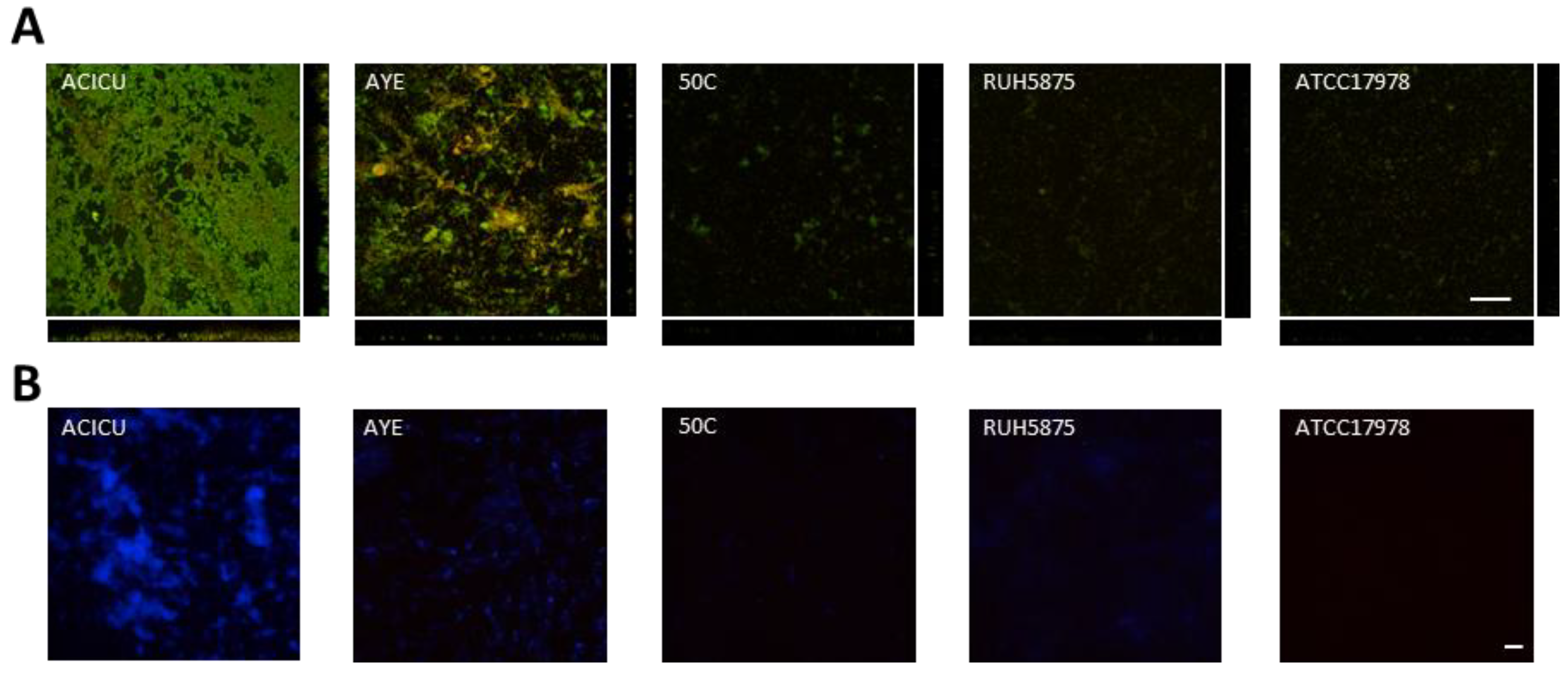 Seven-days biofilm of selected A. baumannii strains grown in TSBD. (A) Confocal microscope images (x-y plane and side view) of A. baumannii biofilms stained with acridine orange, a fluorescent dye which labels double-stranded nucleic acids (prevalently DNA) in green, and single-stranded nucleic acids (prevalently RNA) in red. (B) A. baumannii biofilms stained with the calcofluor white for exopolysaccharide labelling [19,28], and analyzed by fluorescence microscopy. Scale bar: 50 μm.