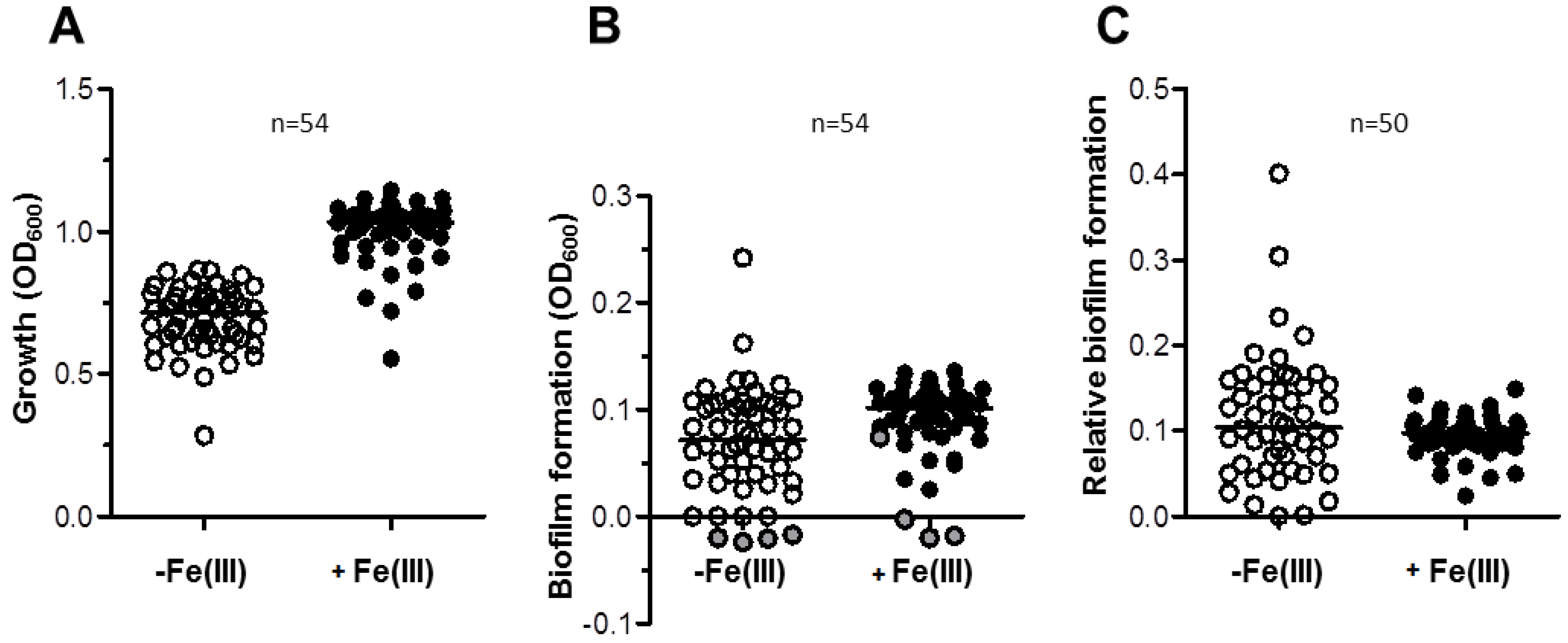 Growth and biofilm formation in a representative collection of 54 A. baumannii strains from clinical and veterinary sources. (A) Growth of 54 A. baumanni strains for 48 h in 96-wells microtiter plates containing 100 µL TSBD supplemented (black circles) or not (white circles) with 100 μM FeCl3, as indicated. (B) Absolute values of biofilm formation by the same isolates shown in panel A, evaluated by the CV staining assay (OD600). Grey circles (B) represent the values for strains that in either or both conditions yielded negative biofilm values, and were excluded from calculations in panel C. (C) Relative values of biofilm formation (Biofilm formation (OD600)/Growth (OD600)) for a subset of 50 biofilm-producing isolates. The line bar represents the median value for each group. Values for each strain are the average of three independent experiments.