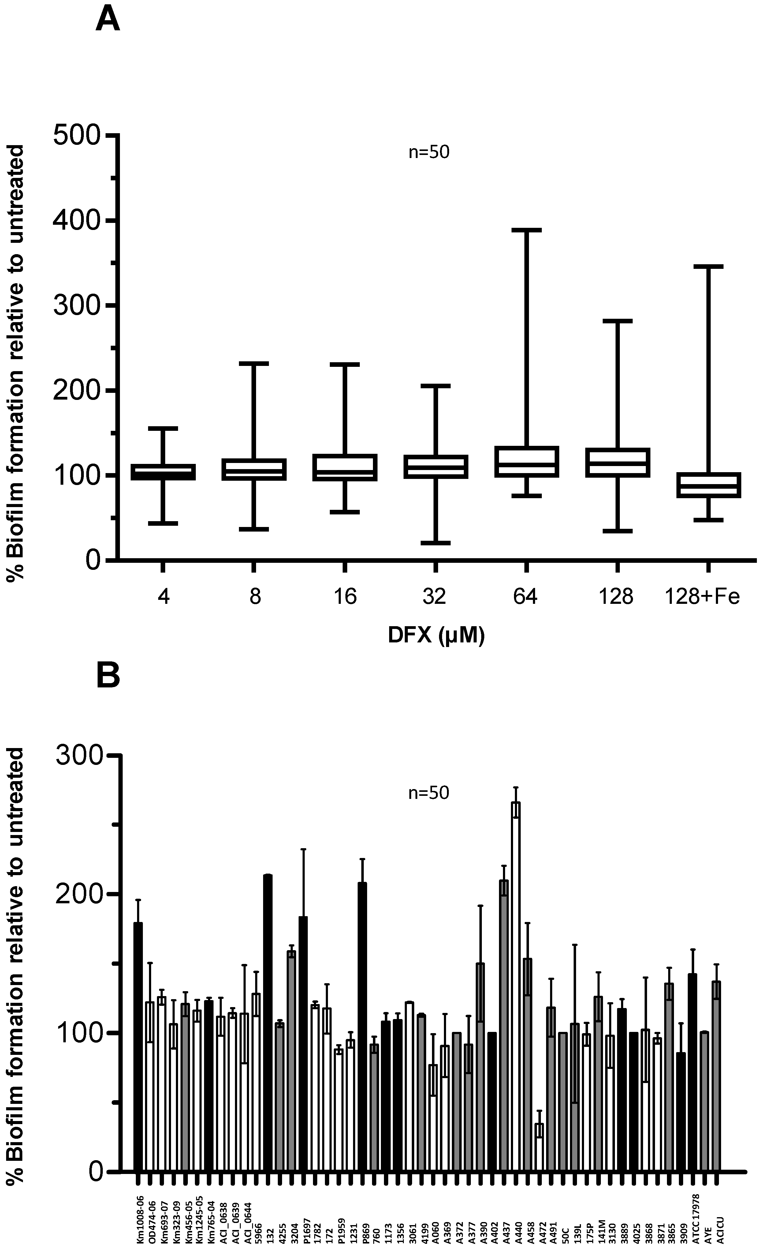 Effect of DFX on A. baumannii biofilm formation. (A) A. baumannii strains were grown statically for 48 h in microtiter plates containing 100 μL TSBD supplemented with DFX at indicated concentrations, or 128 µM DFX plus 100 µM FeCl3. Biofilm formation (OD600 in the CV staining assay) was normalized by the growth yield (OD600 of the culture) and expressed as percentage relative to the DFX-untreated control (TSBD). Boxes represent medians, second and third interquartiles; whiskers represent range of 50 isolates tested. (B) Relative biofilm levels produced by individual isolates in presence of 128 µM DFX, expressed as % of the untreated control in TSBD. With reference to Figure 5C, the bar filling denotes: isolates in which biofilm production was significantly enhanced by iron deficiency (white, 21 isolates), or significantly reduced (black, 12 isolates), or in which iron had no effect on biofilm formation (grey, 17 isolates). In both panels data represent the average of three independent experiments.