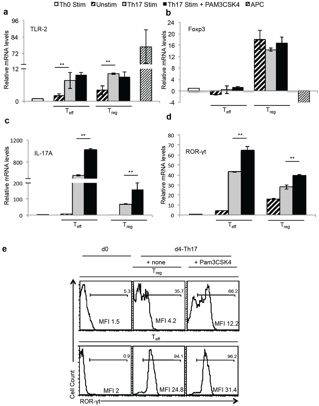 Tregs up-regulate TLR-2, Foxp3, IL-17A and ROR-γt in the presence of Pam3CSK4 and Th17 conditions in vitro. Naïve cells or Tregs were stimulated under Th0 (Th0 stim) or Th17 (Th17 stim) conditions as in “4d”, with or without Pam3CSK4. Unstimulated CD4 T cells (Unstim) and CD90 depleted APC activated with Pam3CSK4 were used as controls (APC). Two days later, RNA was isolated from CD90 sorted T cells from Th17 cultures, and relative mRNA levels of Tlr-2 (a), Foxp3 (b), IL-17A (c) and ROR-γt (d) were assessed using q-PCR. (e) ROR-γt expression of the cells, gated on Foxp3+ CD45.2 Tregs (upper panel), or Foxp3-CD45.1 Teff (lower panel) in the co-cultures is shown. Geometric mean fluorescence intensities (MFI) are shown.