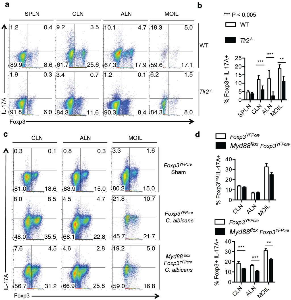 Lastly, we examined the requirement of TLR-2 expression for inducing IL-17A in Tregs during OPC in vivo. Although TLR-2 signaling promotes Treg proliferation during systemic candidiasis, IL-17A induction was not assessed in Tregs during the infection []. To determine the role of TLR-2 signaling in induction of IL-17A in Foxp3+Tregs in vivo, we orally infected WT and Tlr-2−/− mice and measured IL-17A production in CD4+ T cells. We found reduced frequency of Tregs in Tlr-2−/− mice compared to WT mice infiltrating the draining lymphnodes and MOIL during infection (Figure 7a). Importantly, among those Foxp3+CD4+ Tregs the frequency of IL-17A producers was at least three to five times decreased in Tlr-2−/− mice than in WT mice (Figure 7a,b). These data show that TLR-2 signaling enhances proliferation and maximal IL-17A induction in Tregs. Consistent to the role of TLR-2 signaling in promoting IL-17A in effector CD4 cells [], we also found reduced IL-17A production among Foxp3-effector CD4+ cells in Tlr-2−/− mice, when compared to the WT mice (Figure 7a). To further confirm the direct role of TLR signaling in Tregs, we used Myd88fl°x Foxp3YFPcre mice, in which Myd88 gene was conditionally deleted in Foxp3+ cells. Compared to the control Foxp3YFPcre infected mice, the induction of IL-17A was significantly reduced in Myd88fl°x Foxp3YFPcre mice in Foxp3+ cells (Figure 7c,d lower panel). Although there was a slight decrease in IL-17A production even in the effector cells in MOIL, the frequency of IL-17A producing effector cells was unchanged between the groups in CLN and ALN (Figure 7c,d upper panel). Taken together, these results reveal that direct TLR-2 signaling in Tregs plays a crucial role in increasing IL-17A+Foxp3+ Tregs during OPC in vivo.