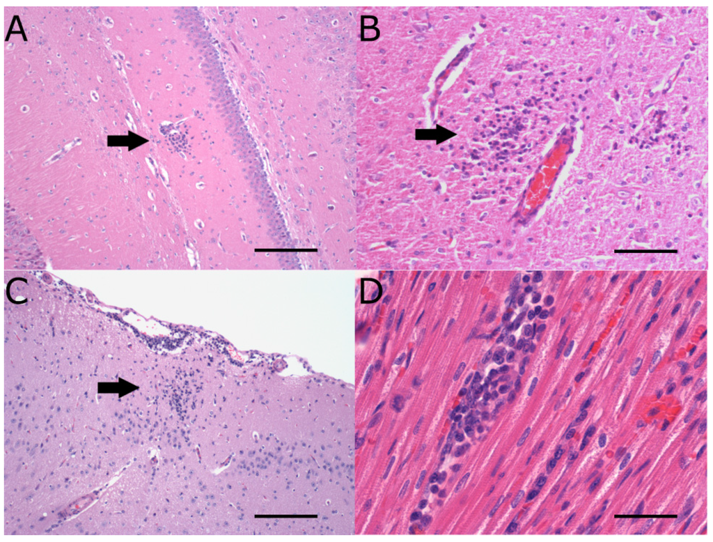 Histopathology of the central nervous system (CNS) and heart. Mononuclear leukocytic infiltrate (black arrow) in the neuropil of brains from NZWRs infected with WNVNSW2011 (A), MVE1-51 (B) and CTRs- infected with WNVTX8667 (C) on day 7 pi. Mononuclear leukocytic infiltrate in myocardium of a NZWR infected with WNVNSW2011 on day 7 pi (D). Panels (A–D) were stained with H&E stain. Magnifications: (A) 10×; (B) 20×, (C) 10×, and (D) 40×. Scale bar in each panel represents 150 µm (A,C), 100 µm (B), and 30 μm (D).