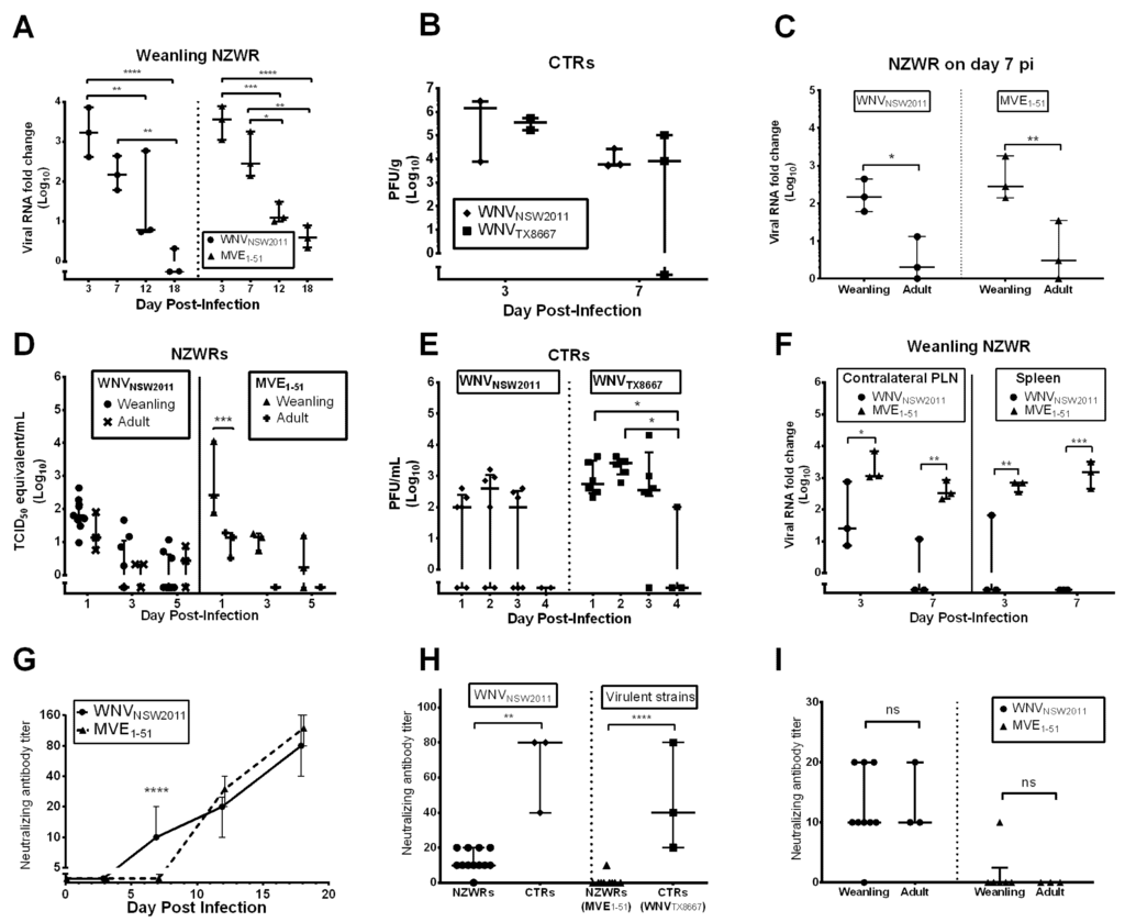 In order to study the potential host factors restricting viremia, the virus-neutralizing antibody response was measured using a plaque reduction neutralization test (PRNT90). A pan-specific flavivirus blocking ELISA was also performed as described [19], with detection of flavivirus specific antibodies in both weanling and adult NZWR MVE1-51 challenged groups. An increasing titer of neutralizing antibodies against the inoculated virus was detected, beginning on day 7 and 12 pi for WNVNSW2011- and MVE1-51- challenged weanling NZWRs, respectively (Figure 3G). The overall neutralizing antibody titers between the two weanling NZWR groups was not significantly different to each other (F1,8 = 2.425, p = 0.1253); however, the titers reached on day 7 pi for WNVNSW2011-challenged weanling NZWRs (median: 10, IQR: 10–20) was significantly higher than those observed in MVE1-51 challenged weanling NZWRs (median: 0, IQR: 0–2.5, p < 0.0001). The neutralizing antibody titers in the adult NZWR groups on day 7 pi (WNVNSW2011: median: 10, IQR: 10–20; MVE1-51: median: 0, IQR: 0–0) were comparable to those in the weanlings challenged with the corresponding virus (Figure 3I, F1,17 = 0.02651, p = 0.8726). Notably, neutralizing antibody titers in WNVNSW2011-challenged CTRs were significantly higher than those in WNVNSW2011-challenged NZWRs on day 7 pi (Figure 3H; CTR median: 80, IQR: 40–80, p = 0.0094). Titers in CTRs infected with WNVTX8667 were comparable to those in CTRs infected with WNVNSW2011 (p = 0.3748). But between the two virulent-virus controls of each rabbit species, CTRs infected with WNVTX8667 had significantly higher neutralizing antibody titers than NZWRs infected with MVE1-51 on day 7 pi (Figure 3H, p < 0.0001).