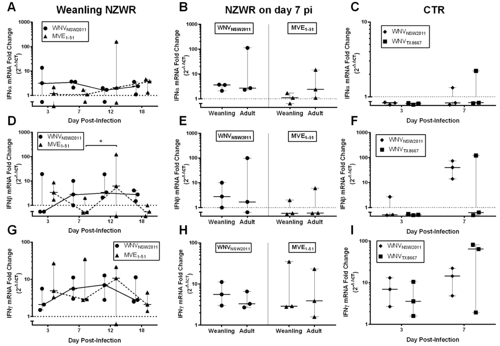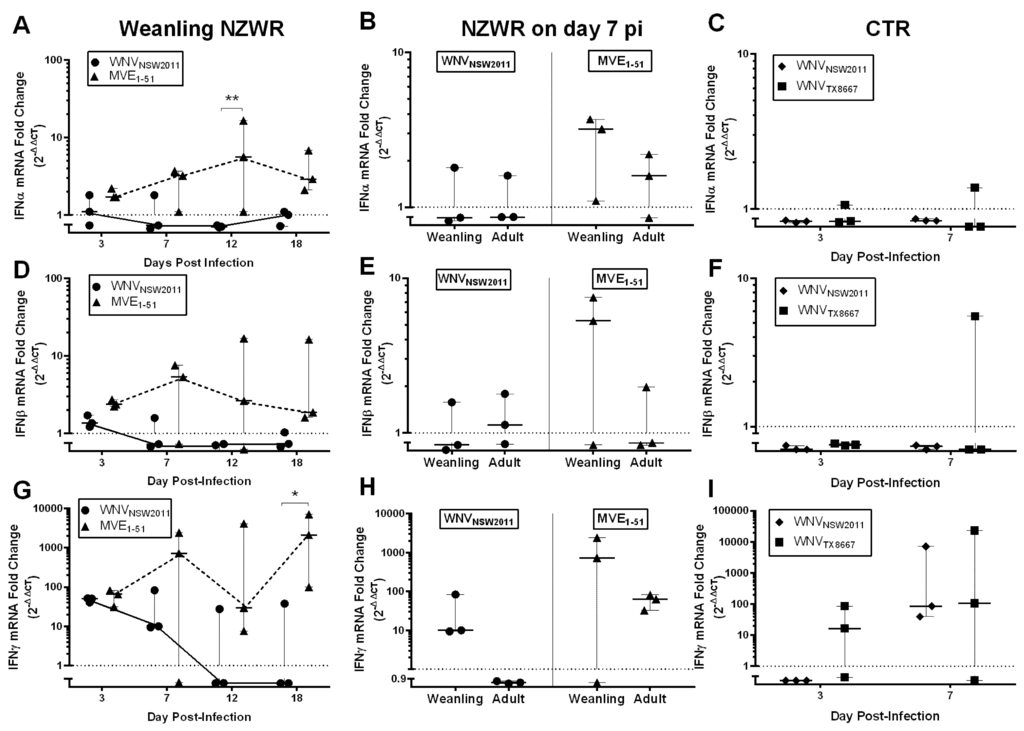 Overall, between WNVNSW2011 and MVE1-51 infected weanling NZWRs, there was a significant difference in the levels of IFN-I and -II transcription in the brain (Figure 4A,D,G; IFNα: F1,16 =18.6700, p = 0.0005; IFNβ: F1,16 = 9.377, p = 0.0074; IFNγ: F1,16 = 8.917, p = 0.0087), but not in the draining PLN (Figure 5A,D,G; IFNα: F1,15 = 0.0094, p = 0.9242; IFNβ: F1,14 = 0.1487, p = 0.7056; IFNγ: F1,15 = 0.9710, p = 0.3401).