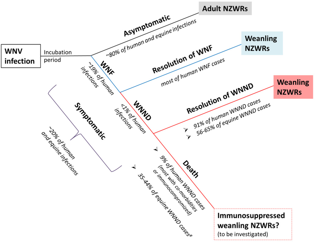 Schematic depiction of how NZWR can model the different aspects of human and equine WNV infections. Our study has shown that WNV-infected NZWRs produce a non-lethal phenotype that is representative of most human and equine infections. The asymptomatic nature of WNV infection in adult NZWRs makes this group of rabbits an appropriate model for determining factors responsible for asymptomatic resolution of human and equine WNV infections. Mild fever was observed in most weanling NZWRs infected with WNV, with some developing mild-moderate non-lethal neuropathology. This group is, therefore, a suitable model for investigating the mechanisms of WNV disease resolution. We also hypothesize that immunosuppression in weanling NZWRs may produce the lethal phenotype typically seen in fatal human and equine WNND cases. Further investigation is required for this particular aspect. This diagram used information obtained from [1,2,3,4,5,28]. # the reported equine case-fatality rate does not distinguish between euthanatized cases and natural deaths.
