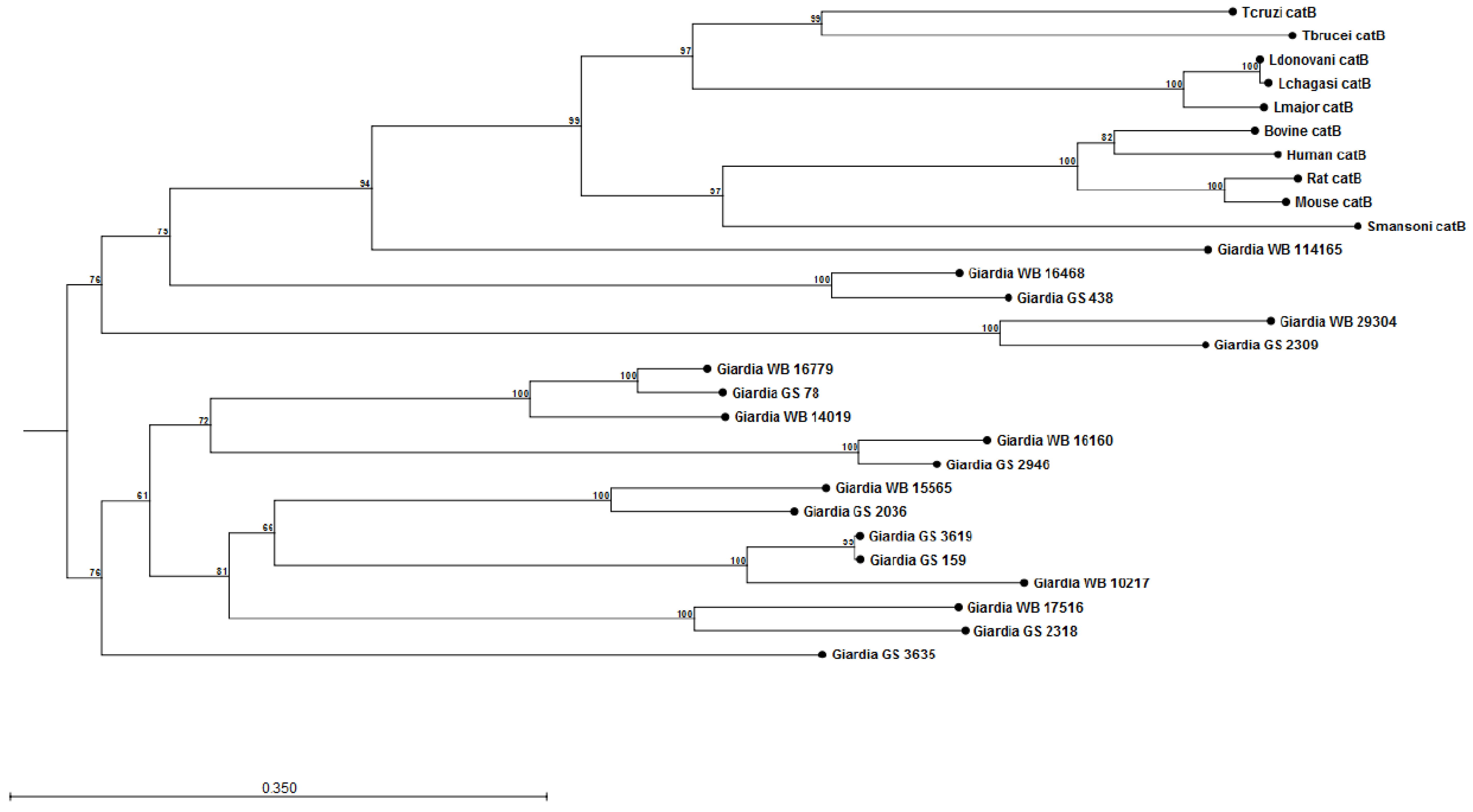 Phylogenetic tree and bootstrap values of Giardia WB and Giardia GS/M cathepsin B cysteine proteases. Proteases were compared against human, bovine, mouse, rat, Schisotoma mansonii, Leishmania major, L. donovani, L. chagasi, Trypanosoma brucei, and T. cruzi catB cysteine proteases. Alignment and phylogenetic trees of cathepsin B cysteine proteases were assembled using ClustalW and CLC Sequence Viewer (Qiagen). These observations indicate that Giardia isolates may contain unique catB cysteine proteases.