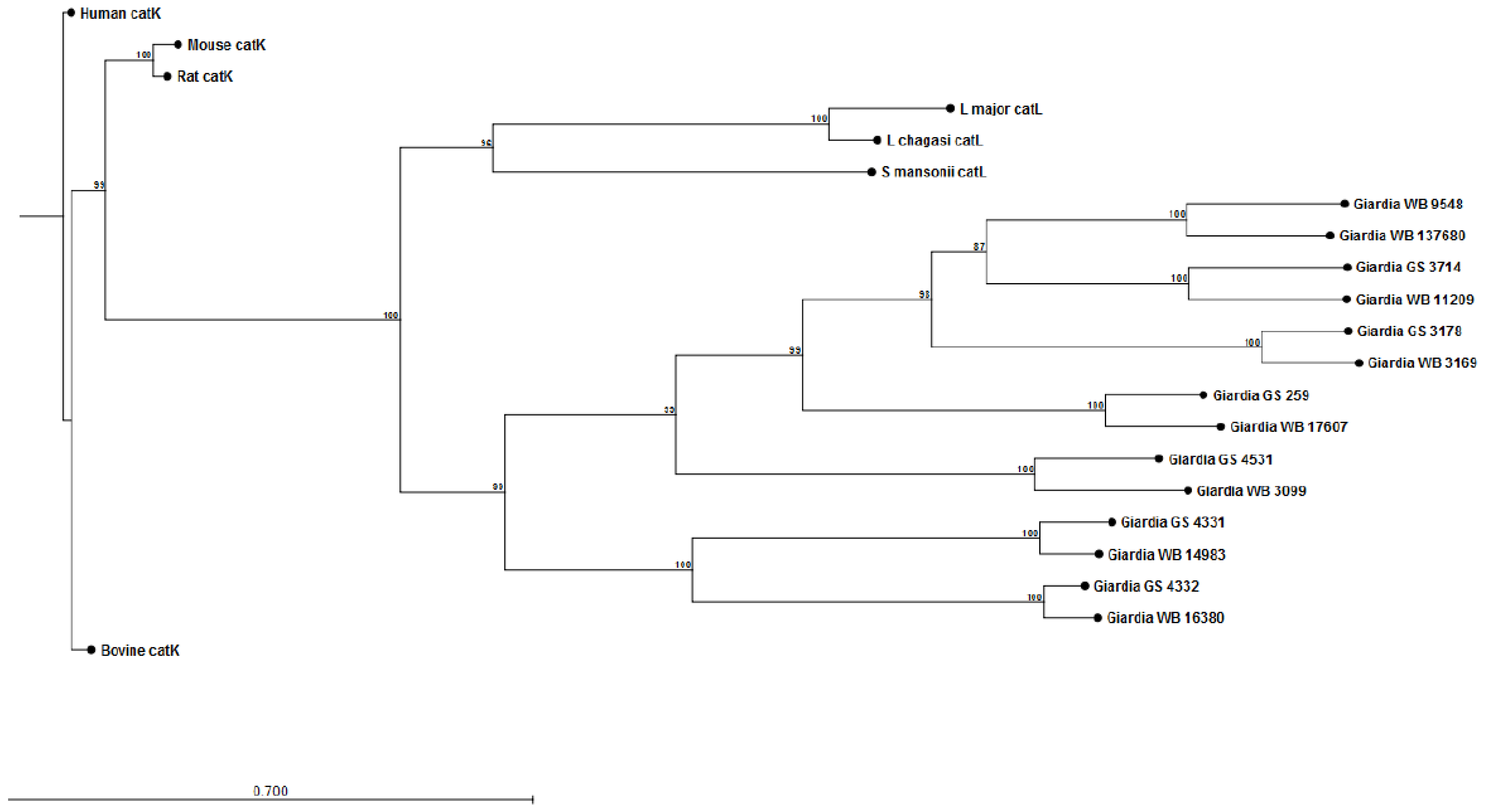 Phylogenetic tree and bootstrap values of Giardia WB and Giardia GS/M cathepsin L cysteine proteases. Proteases were compared against human, bovine, mouse, rat, Schisotoma mansonii, Leishmania major, and L. chagasi catL cysteine proteases. Alignment and phylogenetic trees of cathepsin L cysteine proteases were assembled using ClustalW and CLC Sequence Viewer (Qiagen).
