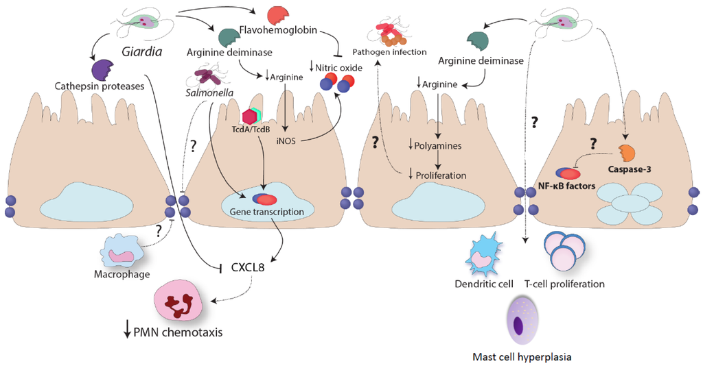 Immunomodulation by Giardia sp. Giardia infections have been shown to attenuate granulocyte infiltration in vivo following intra-rectal instillation of Clostridium difficile toxin A and B (TcdA/TcdB). Giardia trophozoites release cathepsin cysteine proteases that attenuate PMN chemotaxis; it remains unknown how these proteases cross the intestinal epithelial barrier. Arginine deiminase (ADI) released by the parasite consumes L-arginine and this results in attenuated nitric oxide (NO) production. Furthermore, flavohemoglobins released by the parasite decrease the levels of NO. Giardia arginine deiminase also decreases intestinal epithelial proliferation, and this may affect the ability of other pathogens to colonize the intestinal tract. Similarly, during trophozoite-induced intestinal epithelial apoptosis, the activation of caspase proteins may cleave pro-inflammatory transcription factors. Multiple reports have shown that Giardia trophozoites modulate dendritic cell and helper T cell function, and cause mast cell hyperplasia. Additional research is required to characterize the mechanisms and consequences of these observations.