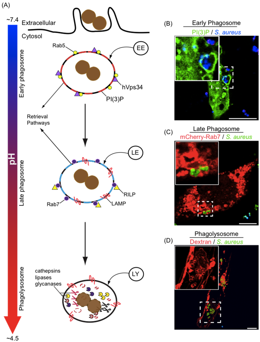 Maturation of phagosomes in macrophages. In (A) the maturation pathway that a newly formed phagosome typically follows is depicted. Nascent phagosomes interact sequentially with compartments of the endo/lysosomal network, giving rise to phagosomes that, at each maturation stage, possess biochemically distinct properties. Phagosomes can be classified as early phagosomes, late phagosomes, or phagolysosomes and the presence of specific markers aid in defining the state of phagosome maturation. Early phagosomes are marked with the small GTPase Rab5, the phosphatidylinositol 3 kinase Vps34, and the phosphoinositide PI(3)P. Late phagosomes are decorated with LAMP-1/2, Rab7, RILP and are devoid of PI(3)P and Rab5. Finally, phagolysosomes that are formed by fusion between late phagosomes and lysosomes, are enriched with hydrolytic enzymes (e.g., proteases, glycanases, and lipases) and are markedly acidic; In (B–D) representative laser scanning confocal micrographs depicting RAW macrophages containing S. aureus USA300 that reside in early phagosomes, late phagosomes, or in phagolysosomes, respectively, are shown. S. aureus in green are expressing GFP and S. aureus in blue were stained with eFluor670; In (B) accumulation of PI(3)P is detected by expression of the lipid biosensor 2xFYVE-GFP; In (C) the distribution of Rab7 expressed as a mCherry-Rab7 fusion protein is shown; In (D) dextran pulse chase experiments were performed to label lysosomes with TMR-dextran (10 kDa) prior to phagocytosis of S. aureus. For each micrograph the hashed box demarcates the region of the micrograph presented in the inset; Note in (D) the GFP channel was omitted from the inset to clearly show the accumulation of dextran around each coccus that appears as a void in the fluorescence. Bars equal ~10 μm. Abbreviations: PI(3)P, phosphatidylinositol-3-phosphate; LAMP, lysosome-associated membrane proteins; RILP, Rab7 lysosomal interacting protein; GFP, green fluorescent protein; TMR, tetramethylrhodamine.