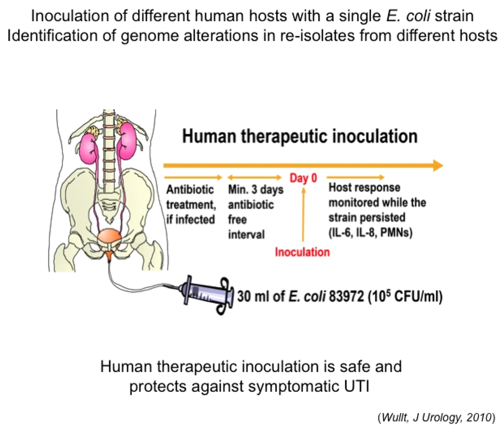 This host-specific loss of gene function supports the hypothesis that evolution towards commensalism rather than virulence is favored during asymptomatic bladder colonization. Ongoing collaborative studies aim to identify the mechanisms by which different hosts personalize their microbiota at the genomic level and the host response variables that drive bacterial adaptation by continuous monitoring of host transcription in individual patients, as well as their state of health and proteomic profile, including inflammatory mediators and immune variables. We also observed that ABU strains actively modify the host environment by inhibiting RNA polymerase II–dependent gene expression [1] and Ambite et al., this issue. The molecular determinants of evolution towards commensalism and host modulation remain to be defined. Innate immune activation is limited in ABU [18], suggesting that different host response pathways and effector molecules drive bacterial commensalism. Human therapeutic inoculation offers a unique setting to study the in vivo interactions between commensals and their human hosts in sufficient detail to address those questions.