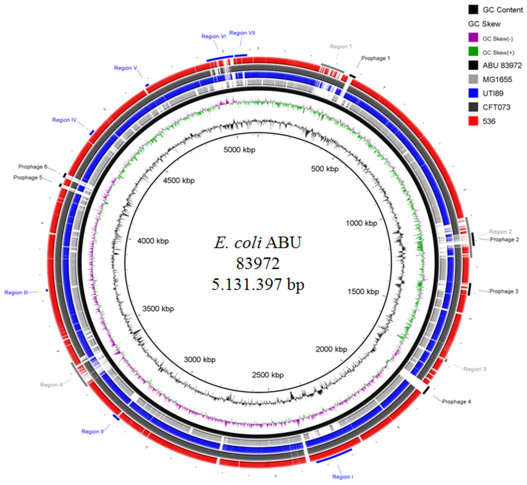 Comparative genome sequence analysis of ABU E. coli isolate 83972. Comparison of the chromosome of E. coli strain 83972 (ABU isolate), E. coli K-12 strain MG1655, and E. coli UTI isolates UTI89, CFT073 and 536. The localization of rather strain-specific or conserved genomic islands (regions 1–4 and regions I–VII) as well as of prophage genomes (prophage 1–6) in the E. coli 83972 chromosome is indicated.