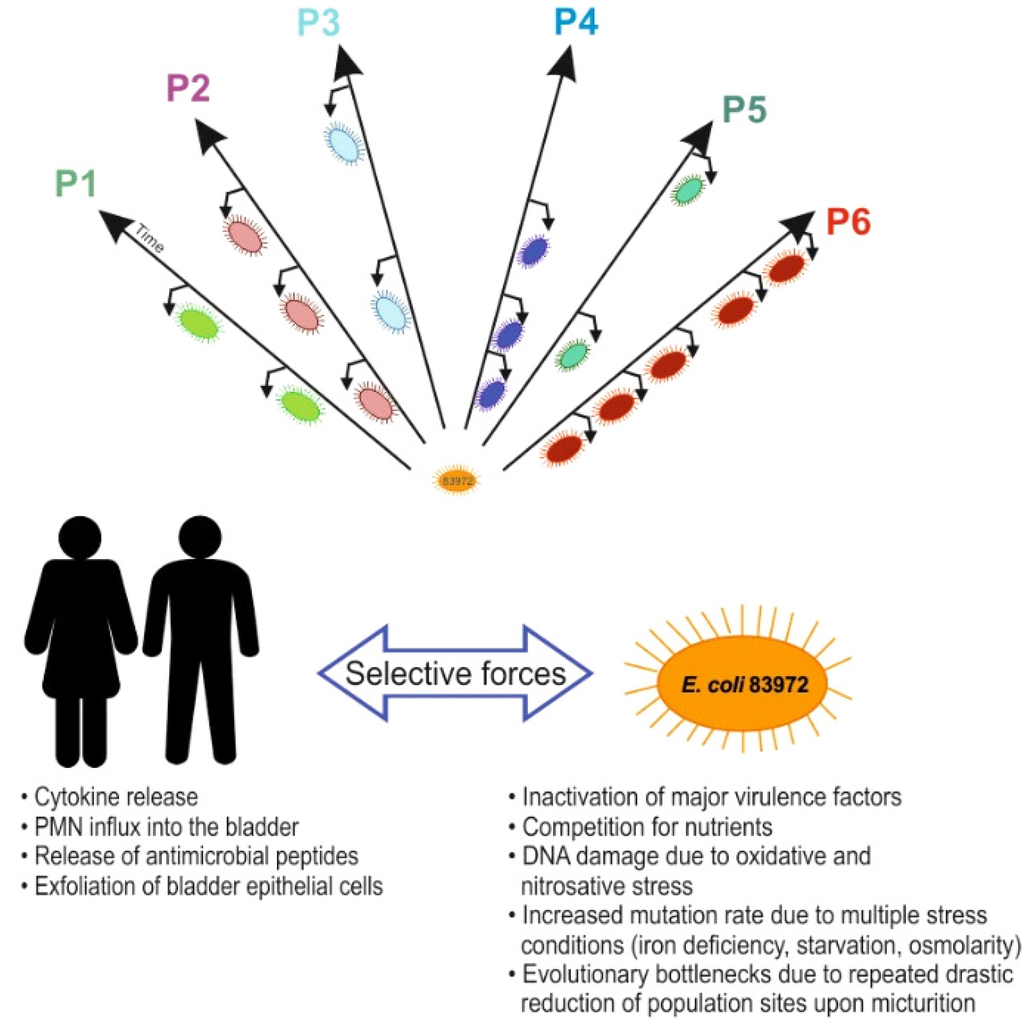 Bacteria increase their fitness in new host niches by rapid adaptation to changing environmental conditions. They lose or gain genetic material and, through selection, new variants become fixed in the population. Evolution has mainly been assumed to favor virulence, which promotes host-to-host spread and tissue attack. Until recently, evolution of commensalism had not been considered. We have proposed that ABU strains evolve towards commensalism in human hosts, as defined by a reduction in overall genome size, inactivation of virulence genes and modifications of transcriptional regulators [10,11]. Some ABU strains, such as the ABU E. coli strain VR50, have been also shown to evolve from commensal strains by gaining colonization factors [12].