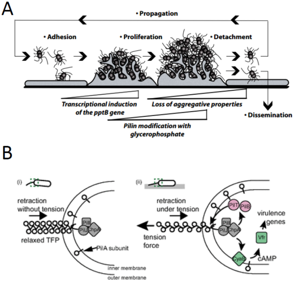 The opportunistic pathogen Pseudomonas aeruginosa (P. aeruginosa) also relies on surface attachment to regulate virulence. P. aeruginosa can adhere to a wide variety of biotic and abiotic surfaces via type IV pili. A comparison between the pathogenicity of planktonic versus surface-associated cells revealed that adherent P. aeruginosa cells upregulated the transcription of a variety of virulence genes and were far more efficient in killing eukaryotic cells in vitro [11]. This adhesion-mediated virulence depends on the minor pilin PilY1, which shares homology to the mechanosensitive von Willebrand factor (VWF) domain [12]. The retraction of adherent type IV pili induces signal transduction through the Chp chemosensory pathway via interactions between PilA and PilJ [13]. Tension on type IV pili results in conformational changes [14]; thus, an intriguing hypothesis is that pilus tension regulates the interaction of PilA and PilJ to mediate a transcriptional response (Figure 1b).