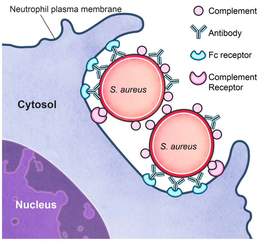 Neutrophil phagocytosis of S. aureus. S. aureus opsonized with serum complement components (complement) and specific antibody (antibody) are efficiently bound by complement receptors and Fc receptors on the surface of neutrophils. Ligation of these receptors drives the process of phagocytosis.