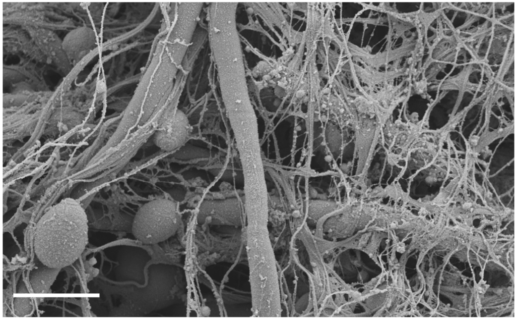 A striking finding from both the rabbit and rat venous catheter biofilms was the presence of a robust extracellular matrix, more extensive than that observed for many in vitro conditions [,,]. This observation suggested the incorporation of host proteins in the extracellular matrix and prompted proteomic analysis of the material []. Surprisingly, nearly all (98%) of the extracellular matrix proteins were of host origin. Over 100 host proteins of a variety of types were identified. The most abundant included hemoglobin, albumin, and alpha globulins. Several represented categories included matricellular proteins, inflammatory or leukocyte-associated proteins, and erythrocyte or heme-associated proteins. Although the role of many of these proteins is unclear, they may be involved in the immune response, fungal acquisition of iron, or scaffolding of the matrix [,,,,,,]. Others may involve non-specific interactions.