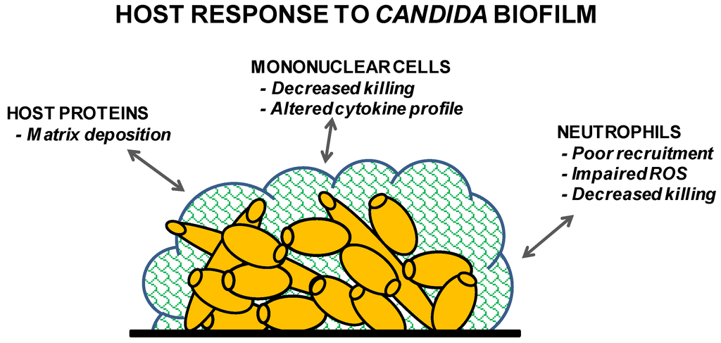 Candida spp. are among the most common nosocomial fungal pathogens and are notorious for their propensity toward biofilm formation. When growing on a medical device or mucosal surface, these organisms reside as communities embedded in a protective matrix, resisting host defenses. The host responds to Candida biofilm by depositing a variety of proteins that become incorporated into the biofilm matrix. Compared to free-floating Candida, leukocytes are less effective against Candida within a biofilm. This review highlights recent advances describing the host’s response to Candida biofilms using ex vivo and in vivo models of mucosal and device-associated biofilm infections.