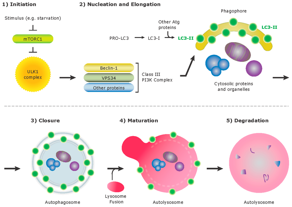 Autophagy is an intracellular degradation system that delivers cytoplasmic materials to lysosomes (Figure 1). There are three different types of autophagy: macroautophagy, chaperone mediated autophagy, and microautophagy. In mammalian cells, macroautophagy, herein referred to as “autophagy”, is characterized by the formation of double membrane vesicles termed autophagosomes, which sequester damaged organelles, protein aggregates, or invading pathogens for degradation. Constitutive autophagy is required for cellular housekeeping such as removing damaged organelles and as a protective mechanism against cellular stress. The autophagy pathway can be initiated by various stimuli, such as starvation, and these triggers are transduced through the suppression of mammalian target of rapamycin (mTOR), which induces the formation of an isolation membrane or “phagophore” and involves multiple components including ULK1 (Unc-51-like kinase1). This process leads to the recruitment of the class III phosphatidylinositol-3-OH kinase (PI(3)K) complex, which includes VPS34, Beclin-1, and promotes the formation of the autophagosome. A complex of the Atg proteins, Atg12-Atg5-Atg16L1, is present on the outer membrane and the microtubule associated protein1 light chain 3 (MAP1 LC3 known as LC3-II) is present on both inner and outer membrane of the isolation membrane. The lipidated form of LC3, termed LC3-II, is conjugated to phosphatidylethanolamine, and is the most commonly monitored autophagy related protein.